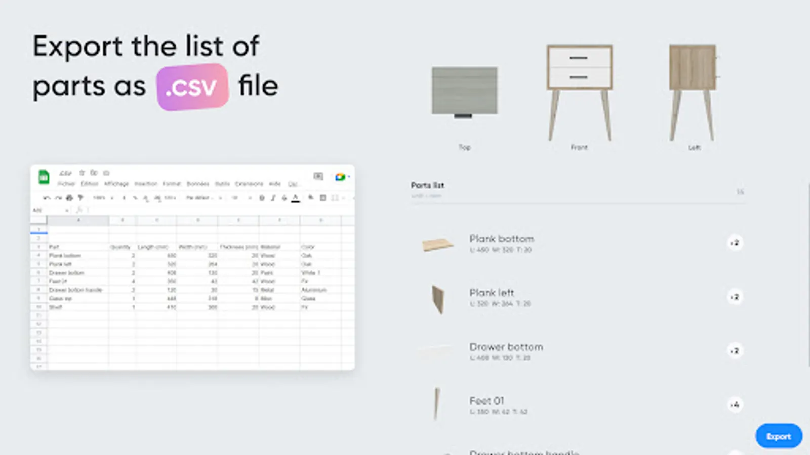 - Export of the part list in .csv format (can be opened with Microsoft Excel or Google Sheets)