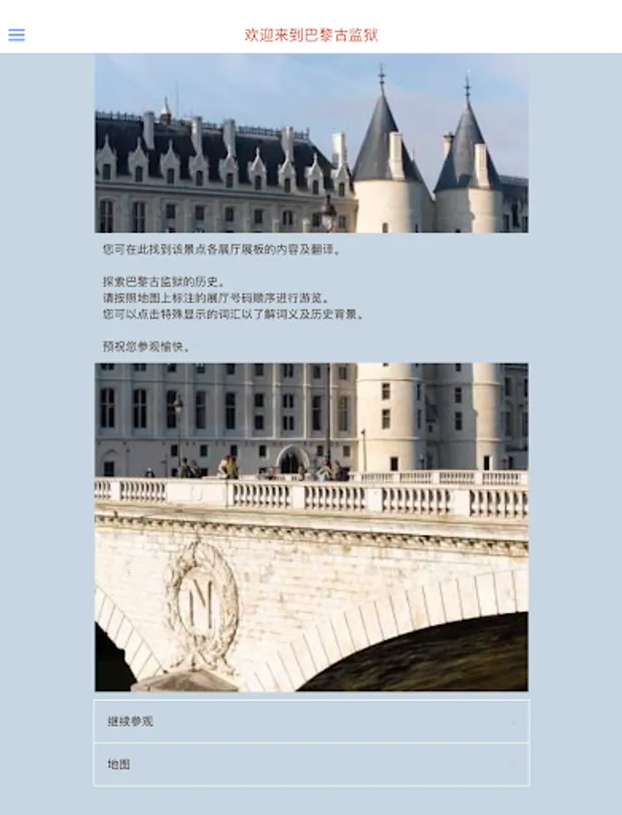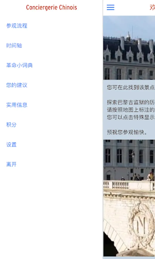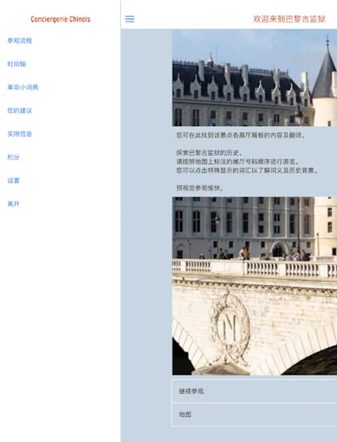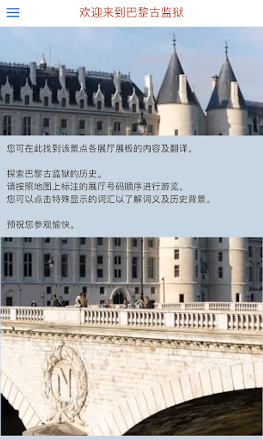 Explore the Conciergerie, the medieval king's palace to become the French Revolutionary Court, and finally became a prison of Marie-Antoinette With this free app, you can: - position themselves on the map Conciergerie in Paris; - Access visit all of the text - use of other content: definitions, schedule ...... download it before visiting the Conciergerie, you will find the Conciergerie is a witness of the most wonderful time of the French historical monuments: