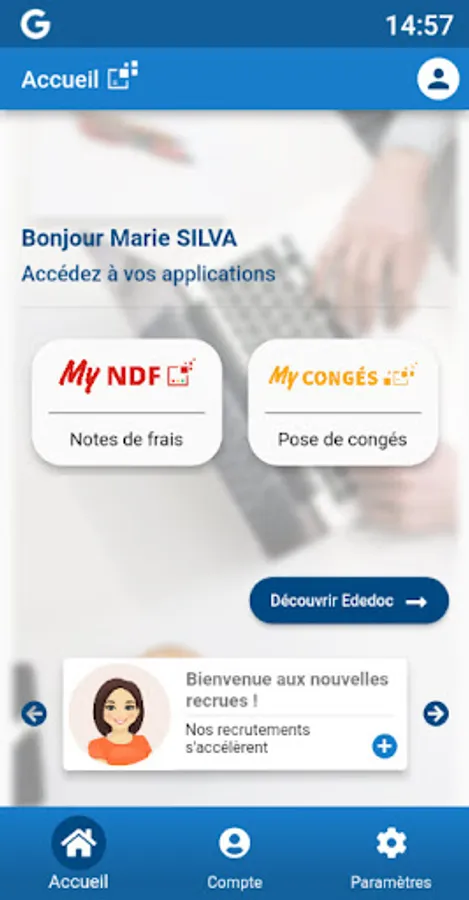 The MyEdedoc application allows you to connect several accounts, switch easily and quickly between the personal account (MyBSE) and professional (MyNDF, MyCongés, News)