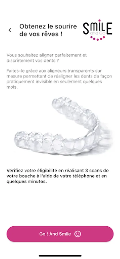 PLEASE NOTE: The Smile & Go app does not provide medical data, health-related measurements, diagnoses or treatment advice. The Smile & Go app is designed to help dental professionals assess patient eligibility before a physical appointment. No treatment will be advised or validated via the application. Only the physical appointment with the dental professional will provide you with such services.