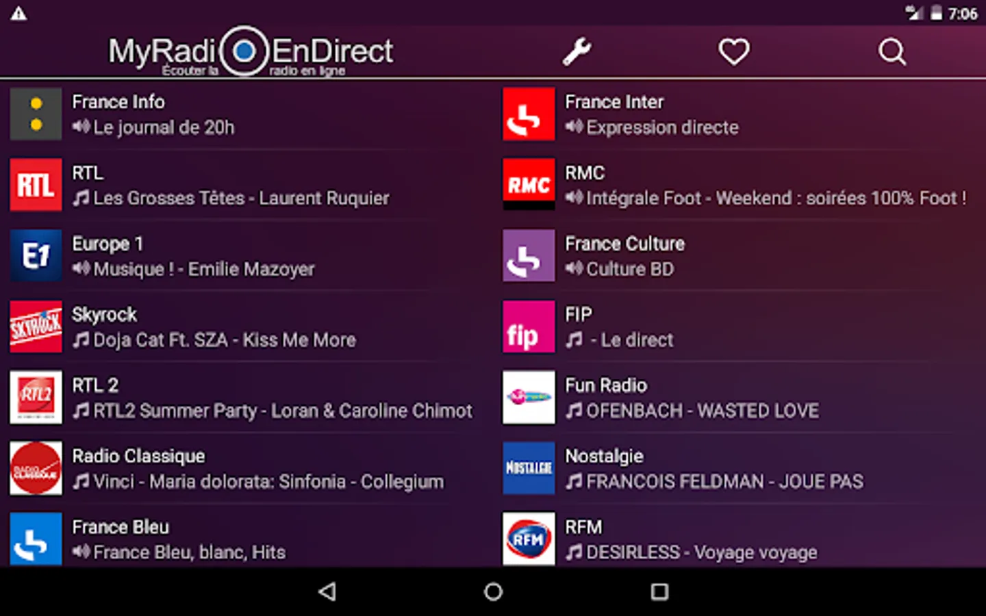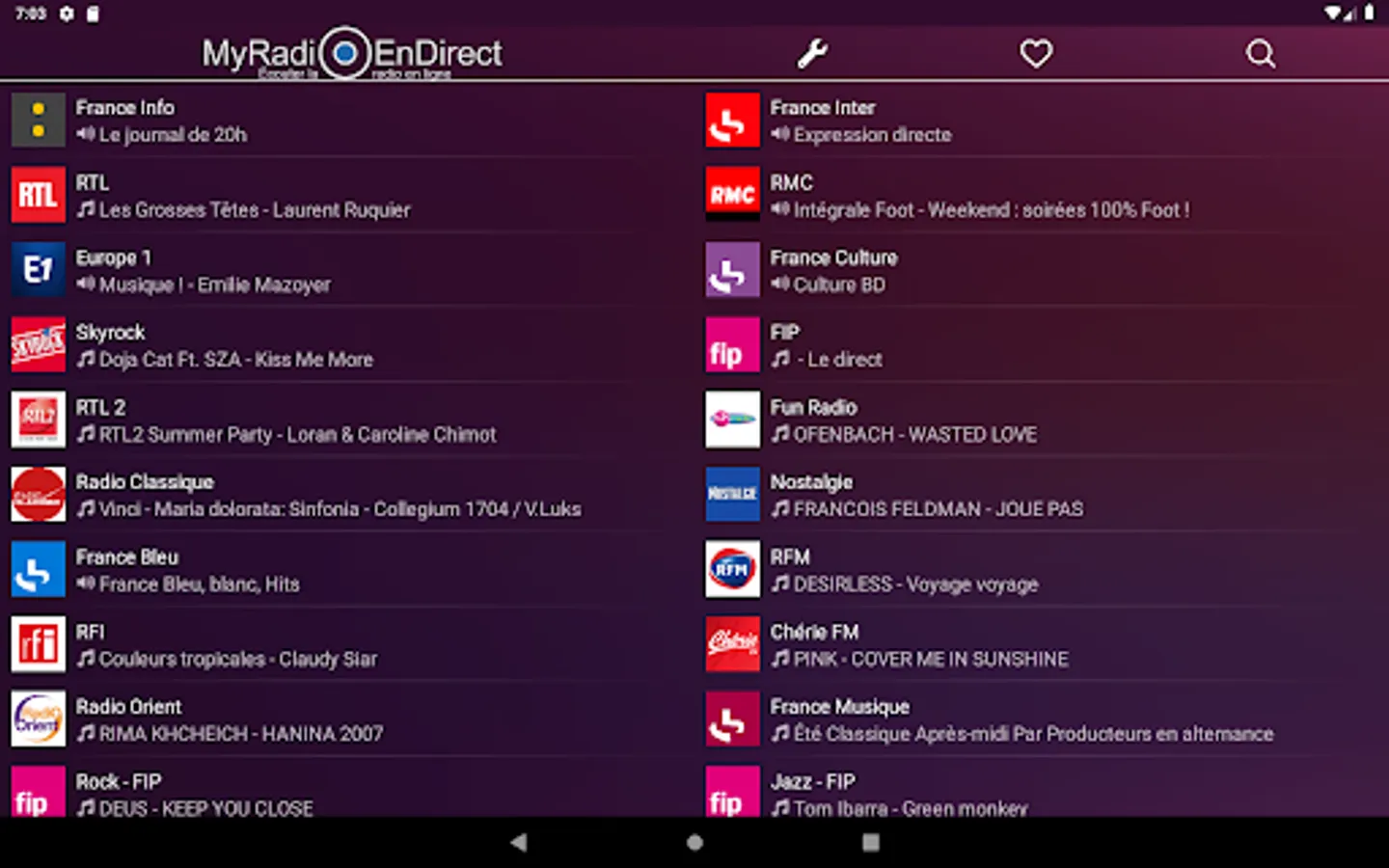 The Android application created for our site operating under the name "myradioendirect.fr" and bringing together French online radio stations, currently has functions similar to those of the Web interface. Currently, it is possible to listen to more than 100 French online radio stations.