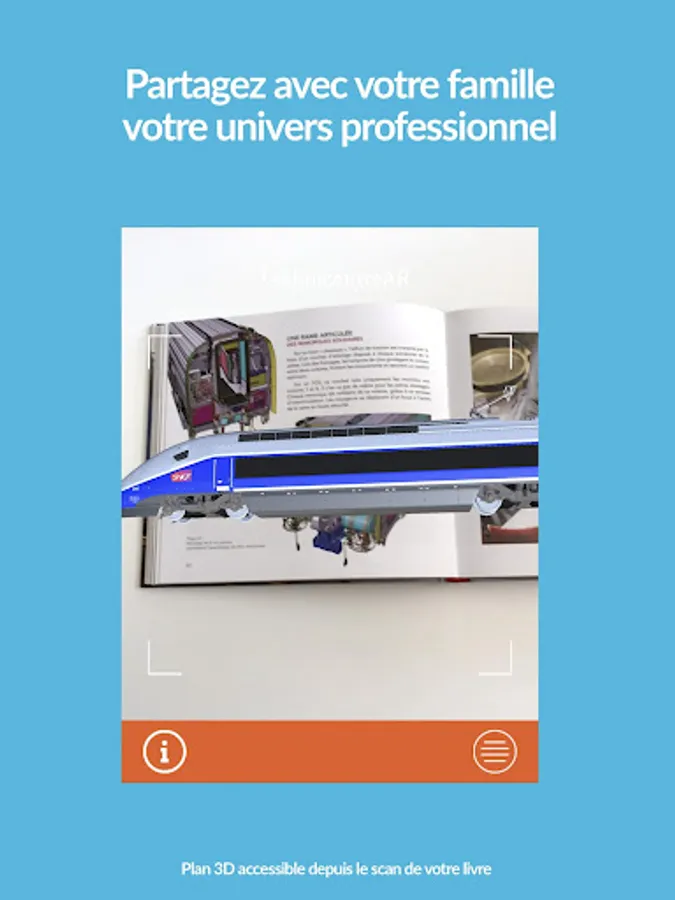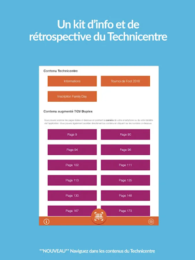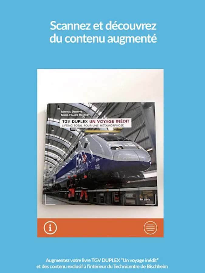 More than an augmented reality tool, find in your pocket Information Kit Technicentre Bischheim. The program includes retrospectives photos, event registration, the increased information ... and always at the rendezvous, a 360 ° experience in pictures and videos, aerial images and many extra features augmented reality. Scan the pages of the book "TGV Duplex, a new journey" with your smartphone and / or your tablet ... and immerse yourself in the heart of Technicentre Bischheim in increased extraordinary experience.
