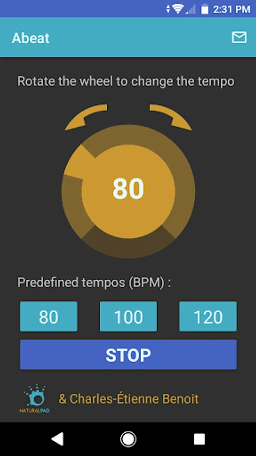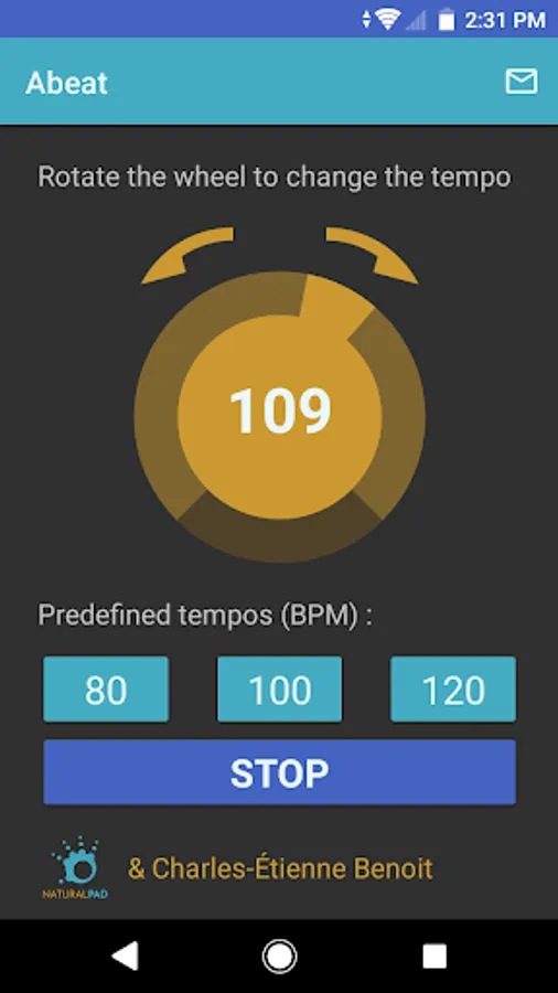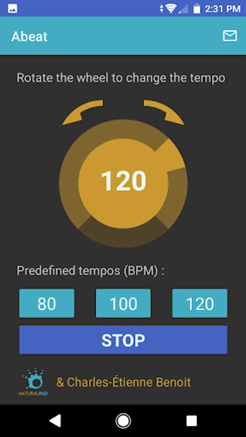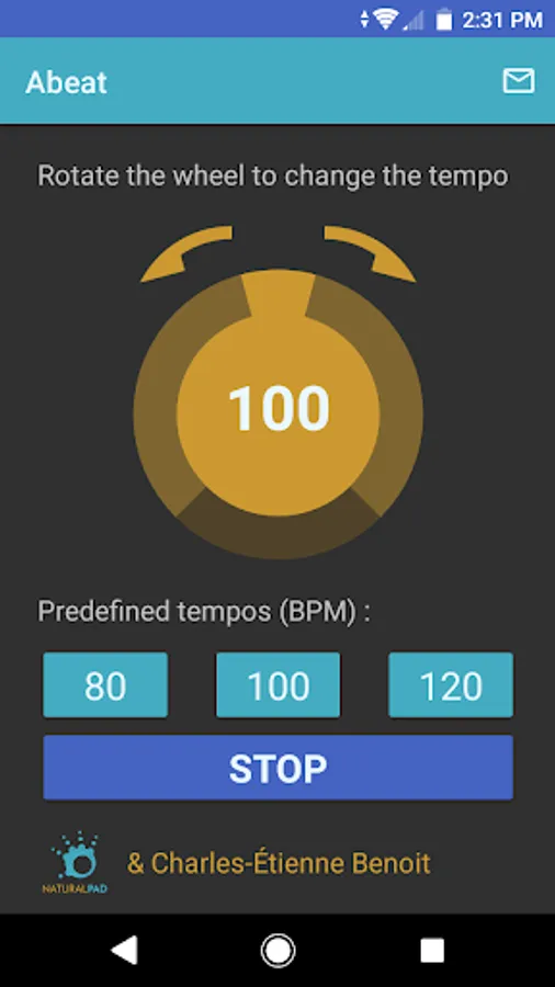 As part of the rehabilitation of people struggling with neurodegenerative pathologies, the use of a rhythmic sound stimuli improves walking abilities. aBeat is developed in collaboration with people who can benefit from this approach. This application allows using a simple interface to select a rhythm and adjust its tempo. The latter is presented as a number representing beats per minute (BPM). The goal is to find the most comfortable tempo for your walking frequency. Follow this rhythm and let yourself be carried away.