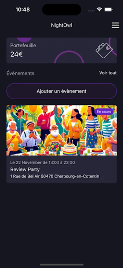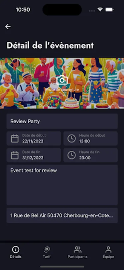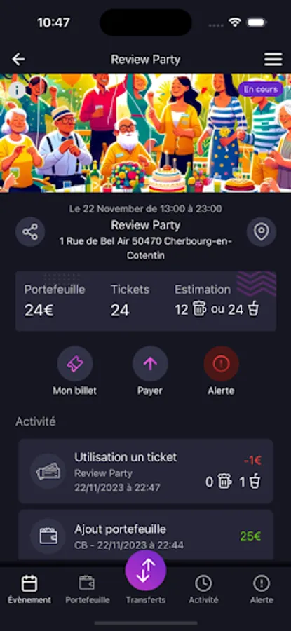 Creation of the event with all the details that will make your mouth water: description, photo, date, location and prices of drink tickets.