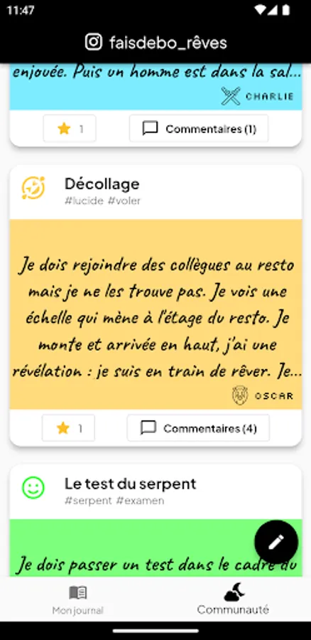 Both dream journal and discussion space, it allows you to write down your dreams and, if you wish, to share some of them with the community under your nickname. You can also do research on the themes that interest you and obtain interpretation leads from other members via the comments.