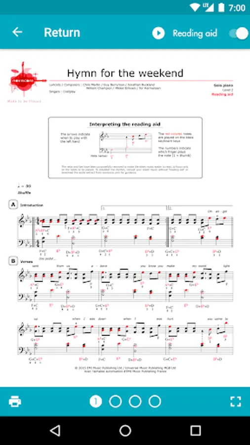 - "Switch" button allows you to toggle the display between the traditional score and the "reading aid"