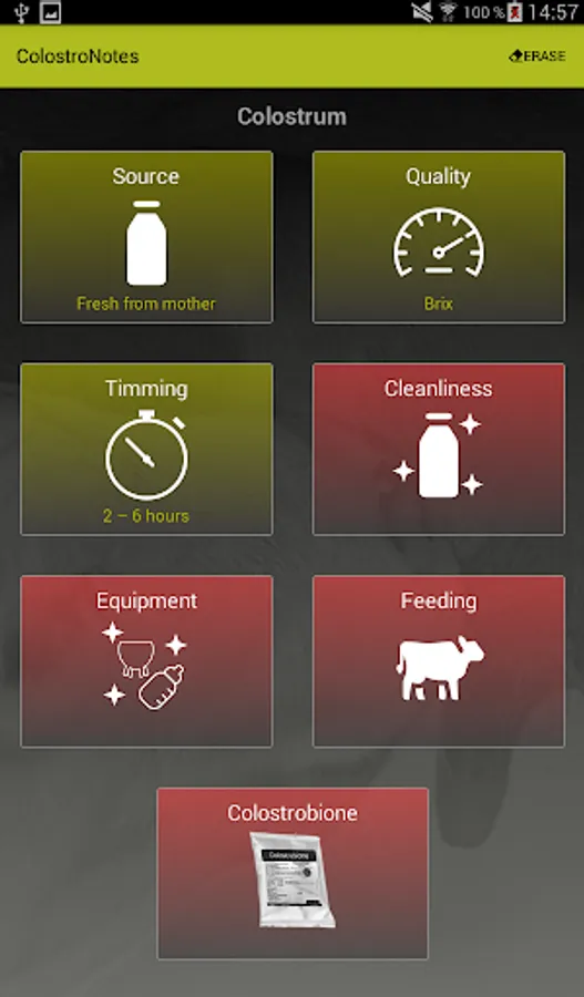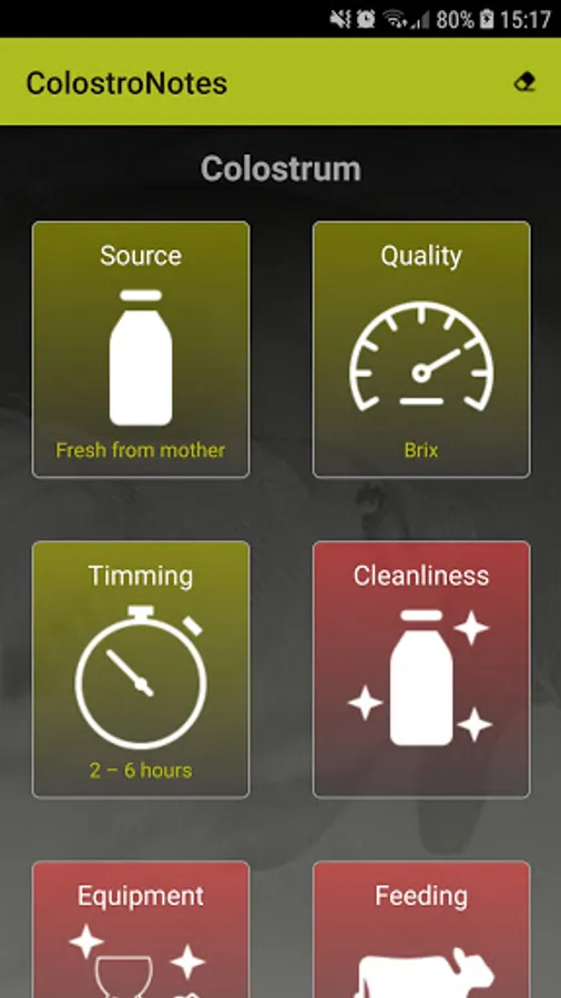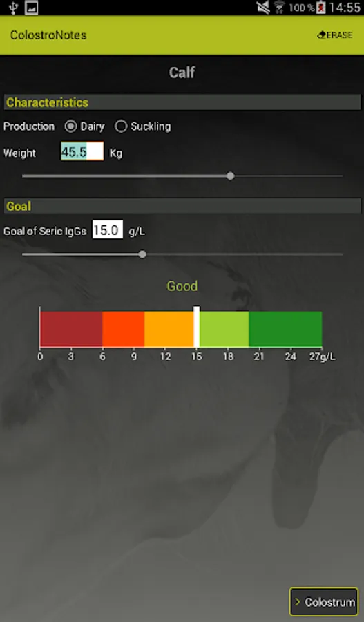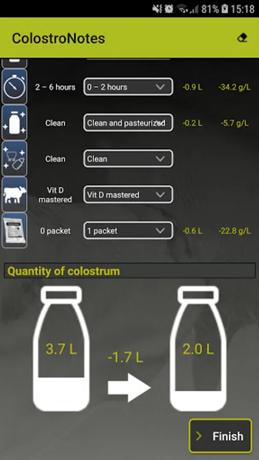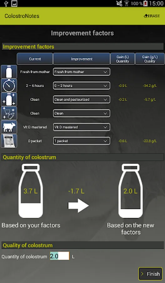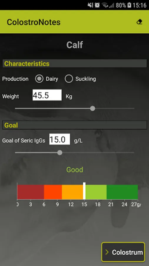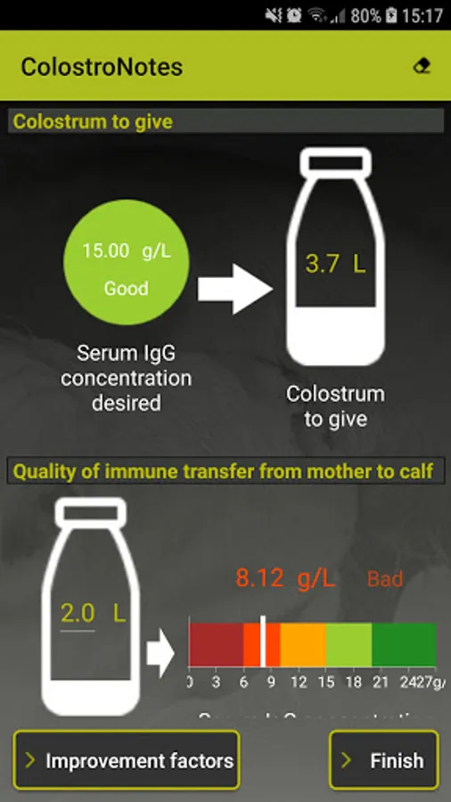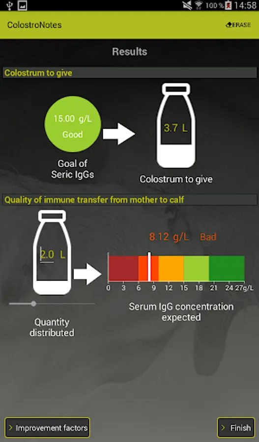 ColostroNotes calculates the quantity of colostrum to be distributed to calves, it allows simulations by varying the most important parameters: quality of colostrum, origin of colostrum, time between birth and distribution and cleanliness of the colostrum but also bottles and udder.