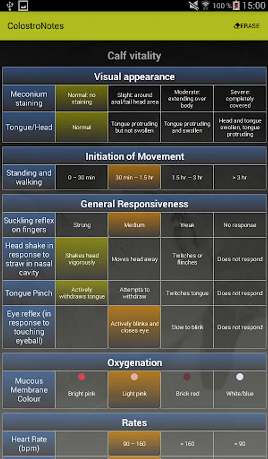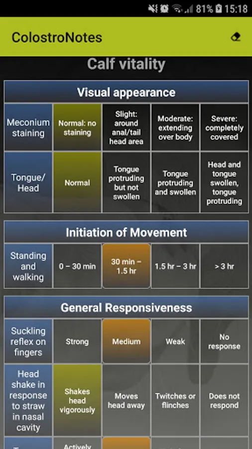 ColostroNotes also calculates the vigor score. After assessing visual appearance, initiation of movements, general responsiveness, oxygenation, heart rate and respiration, ColostroNotes establishes a vigor score and helps make the best decision.