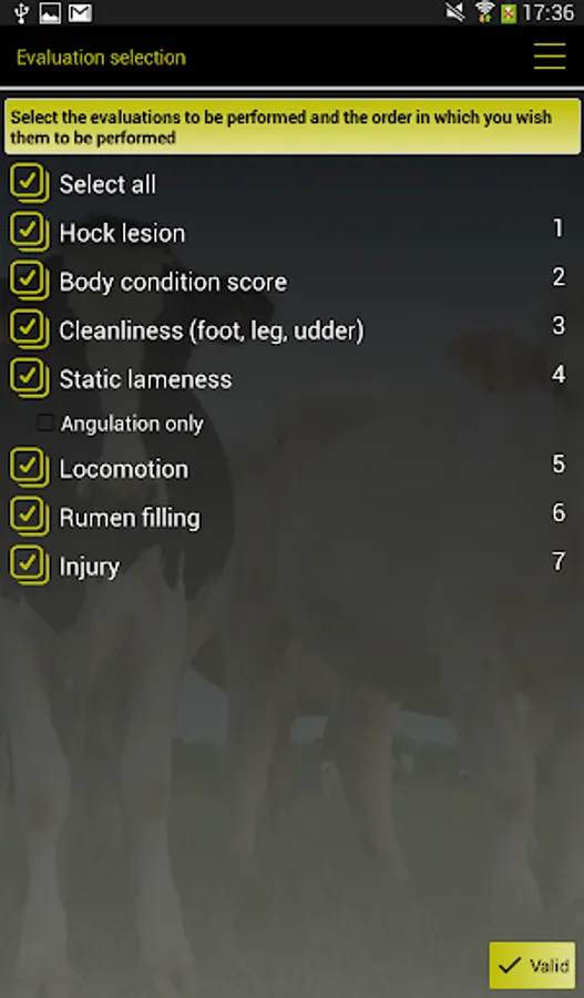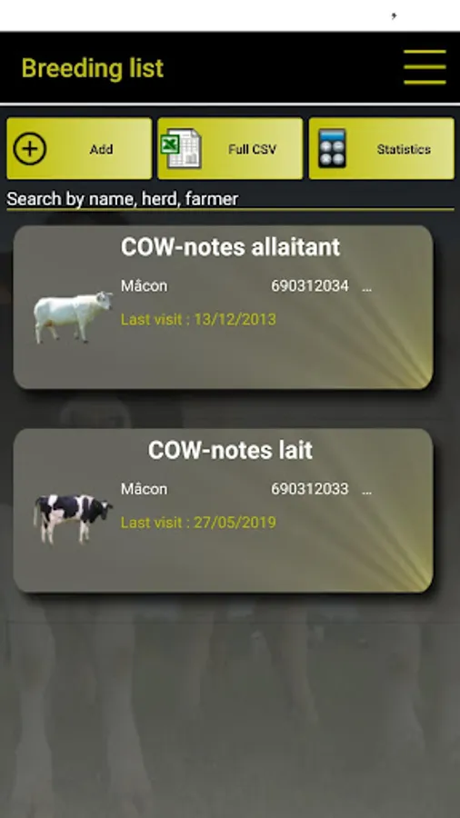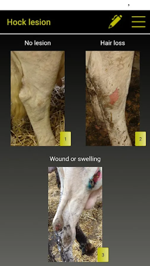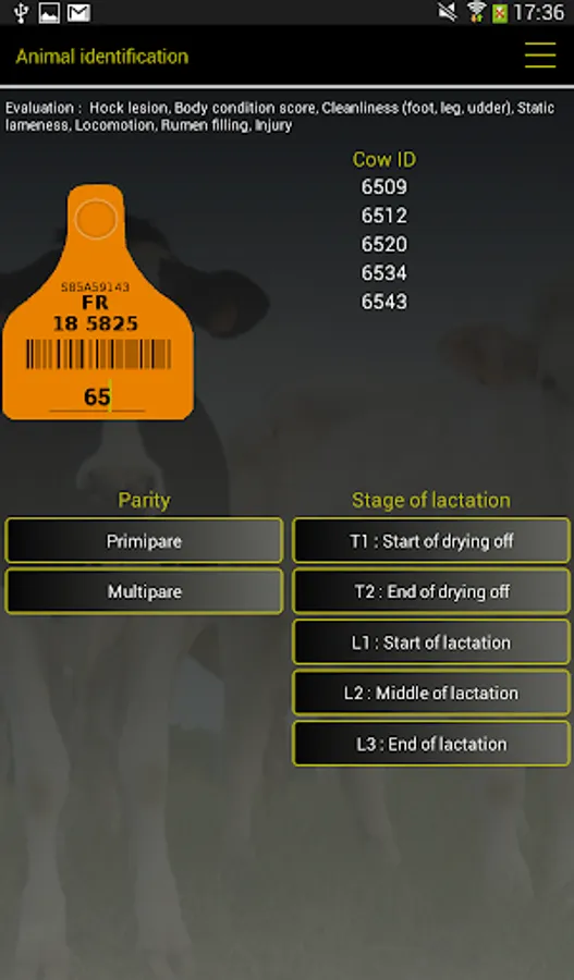 Based on the published interpretation grids, COW notes works on the comparison between the proposed photos by the software and what the user sees in the assessed cow. The user just needs to click on the photo which is the most resembling of what he observes to have a precise notation of assessed criterion. They can be identified by their official number or only by their parity (Primiparous-Multiparous) and their physiological stage, for dairy cows. Special grids are used for B.C.S. of Holsteins, Montbeliardes and beef cattle, and for Cleanliness scores for dairy cows (assessment of Feet, Udder and Leg cleanliness) and beef cattle (official grid IDELE).