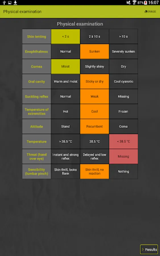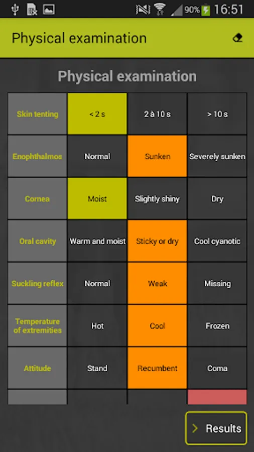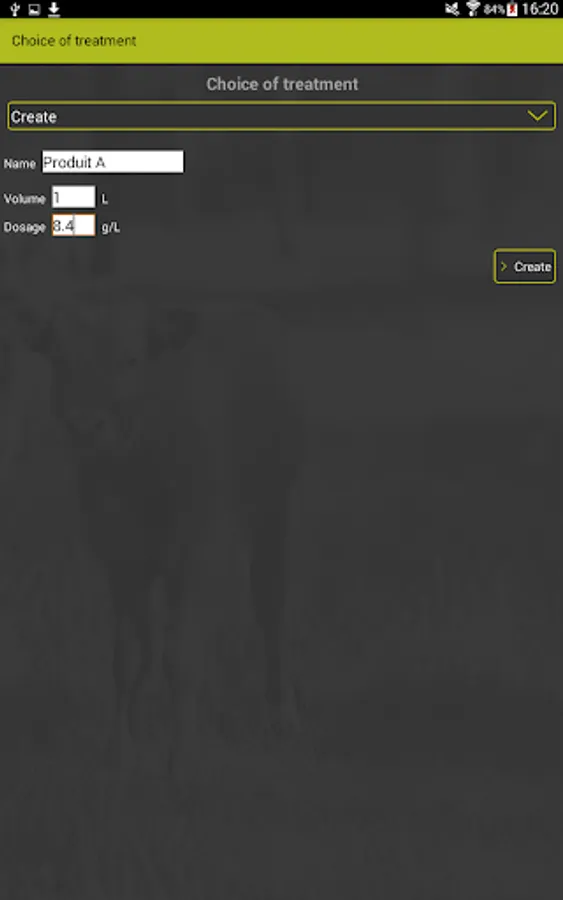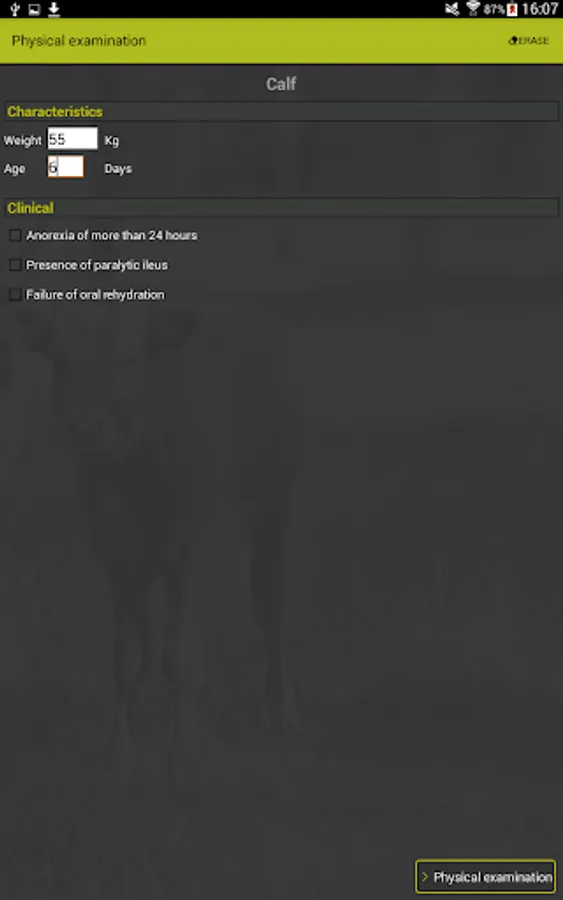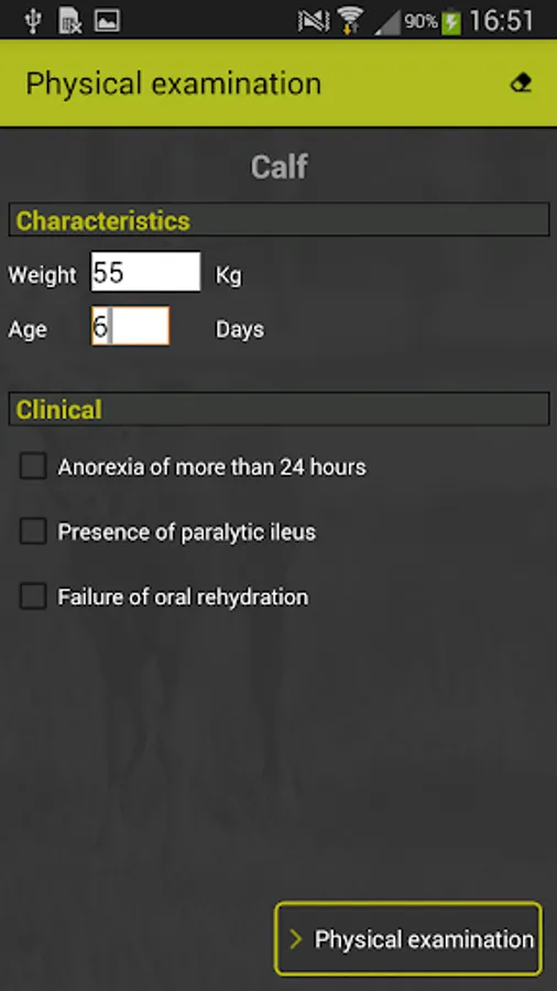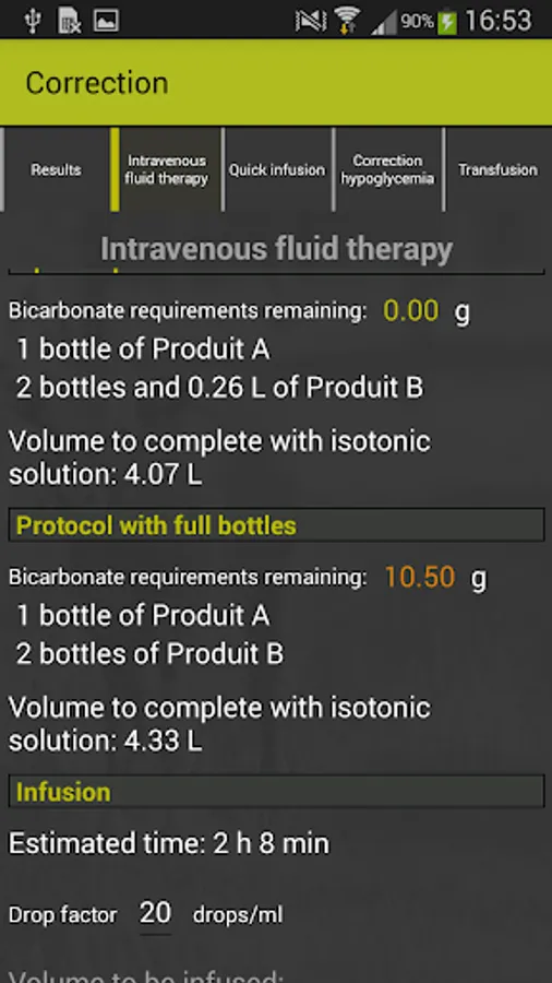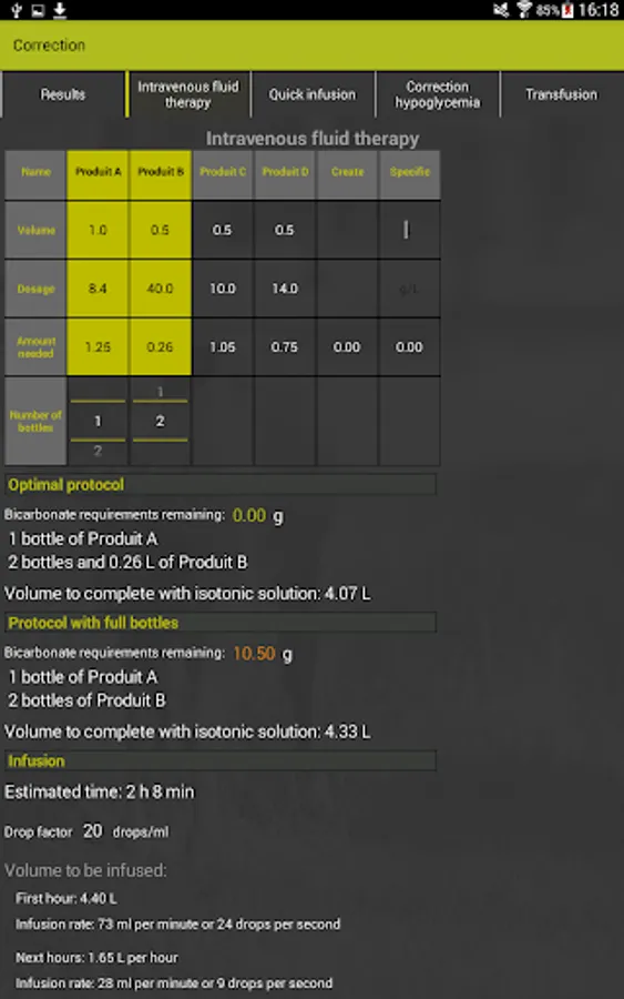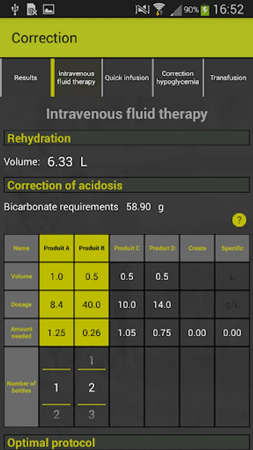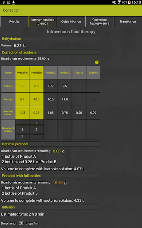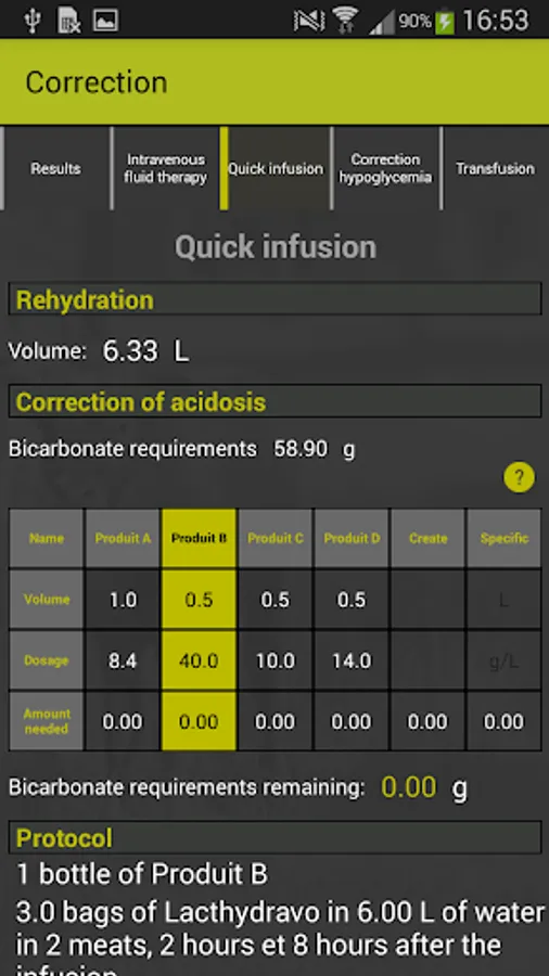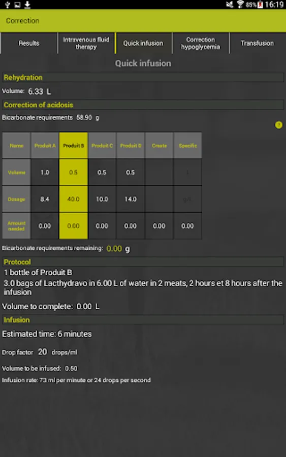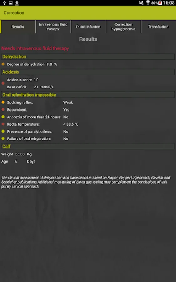 This application is used to calves with diarrhea, dehydration, and metabolic acidosis signs. After entering the weight and age of the calf, the veterinary is prompted to perform clinical examination of the animal. From this clinical examination, the application will then propose the possibility of a fast or slow intravenous infusion. The veterinary chooses the products and the application calculates the number of bottles to correct the acidosis, the volume to correct dehydration and infusion time.