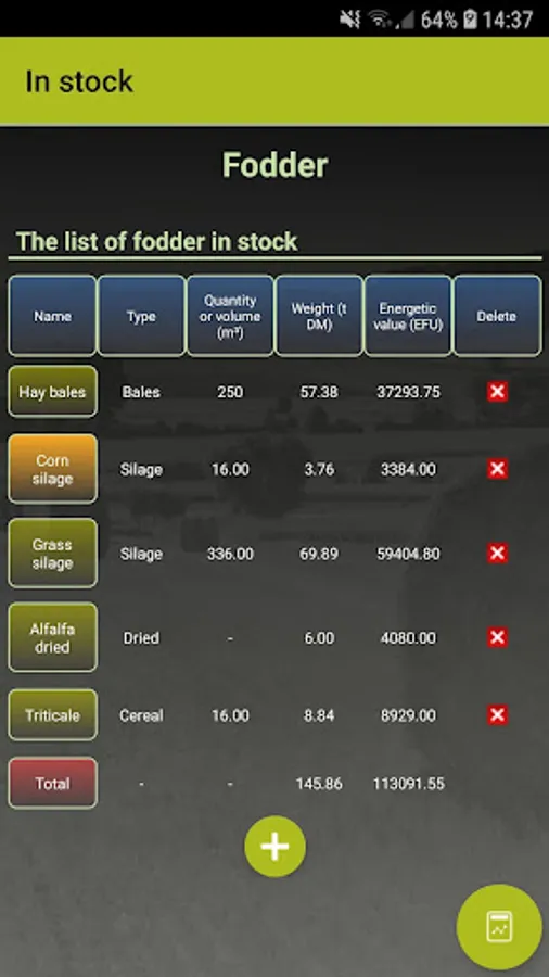 For these fodder the application proposes an energy value (EFU / Kg) and a default density in order to automatically calculate the DM weight of the fodder. It is obviously possible to add a fodder not present by specifying these values.