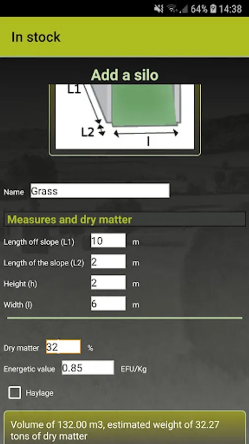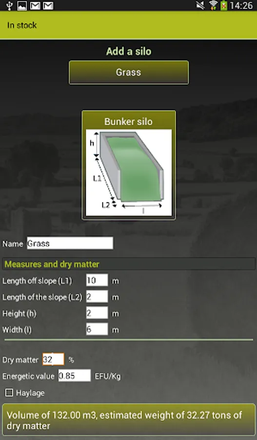 For bale fodder, by selecting the diameter, the application can determine the DM weight of a bale, concerning the silage it simplifies the calculation of the weight of a silo (storage or bunker): just enter the dimensions silo and dry matter percentage to obtain DM tonnage.