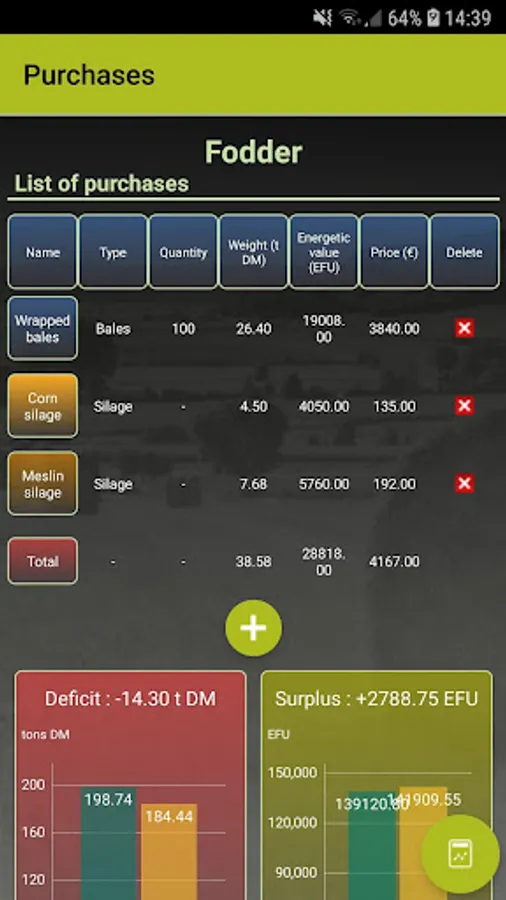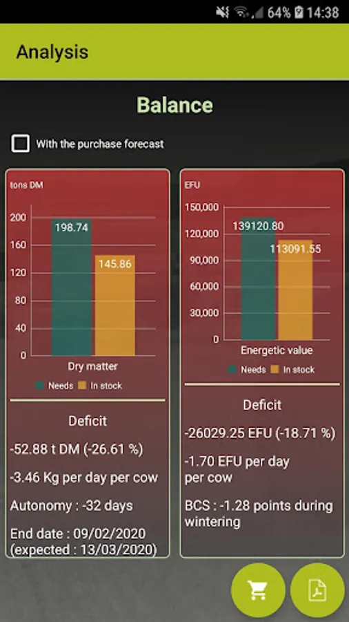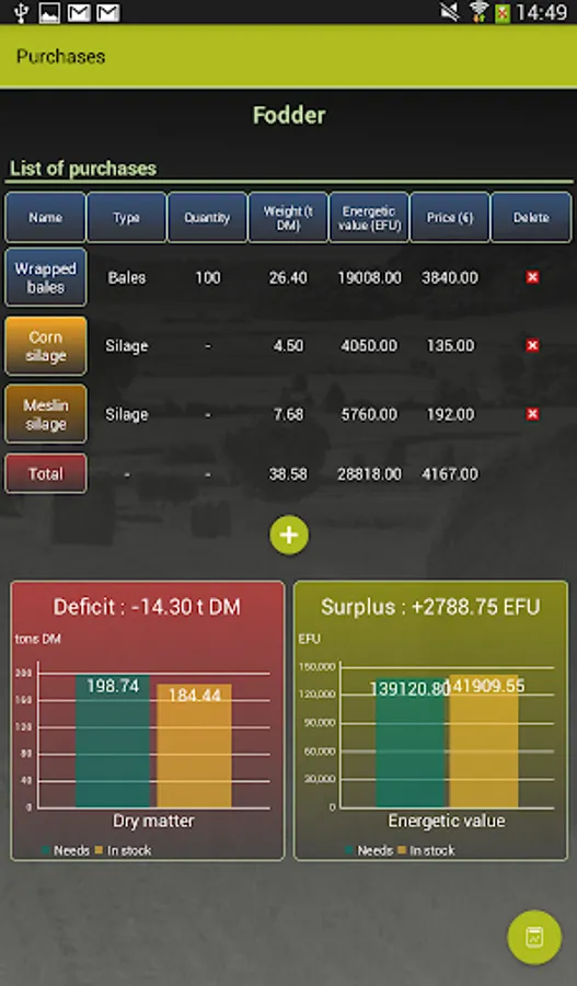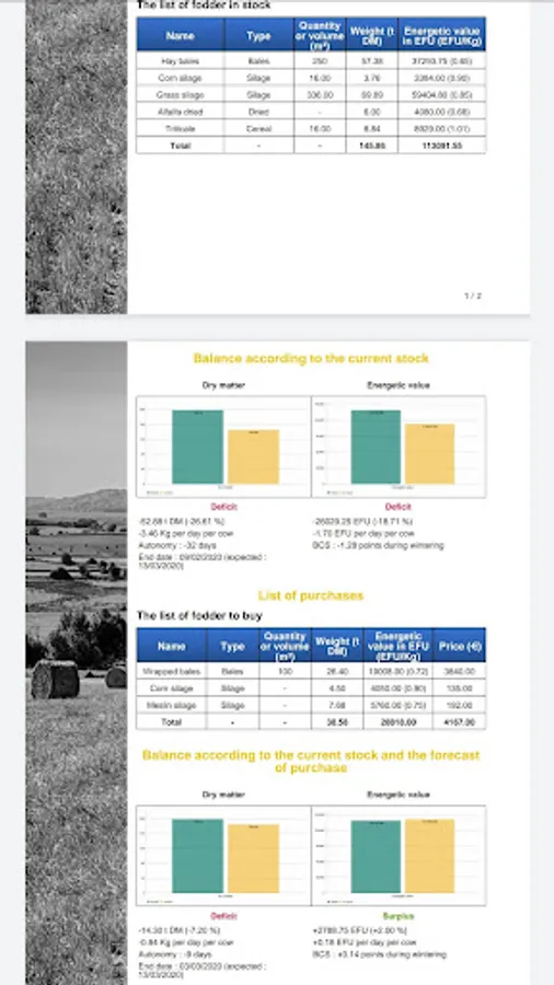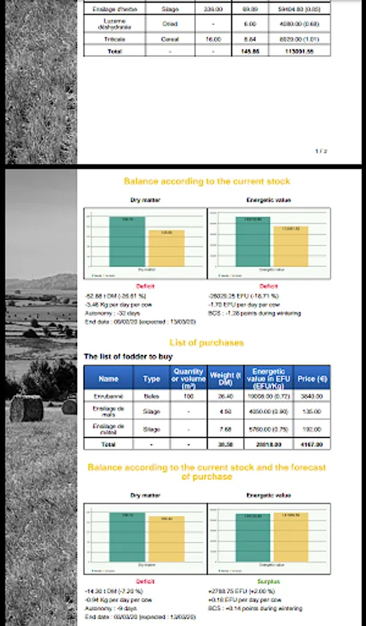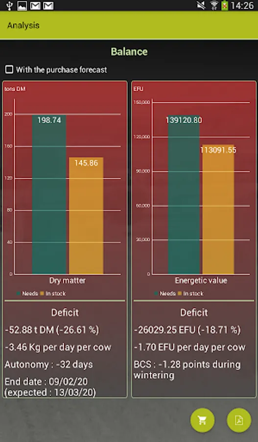 The balance screen allows to quickly visualize the state of the stock (deficit or surplus) compared to the needs of the herd.