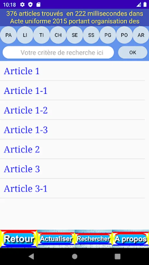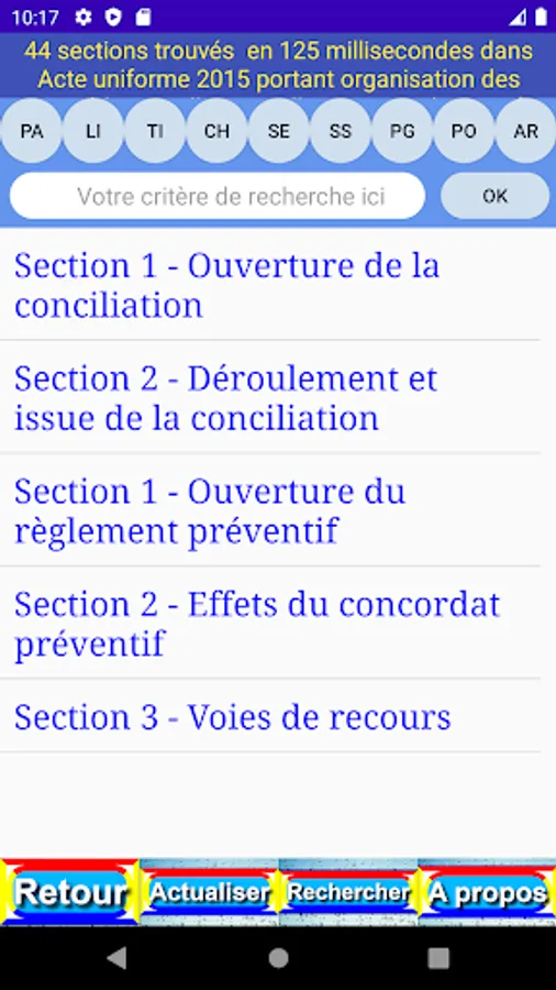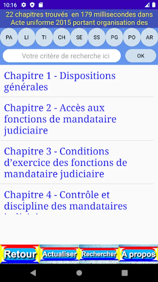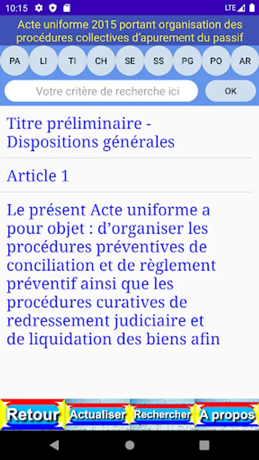 Le critère saisi est retrouvé aisément dans les différents niveaux (livre (LI), partie (PA), titre (TI), chapitre (CH), section (SE), paragraphe (PG), point (PO), article (AR) et contenu (OK)) de la publication.