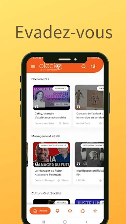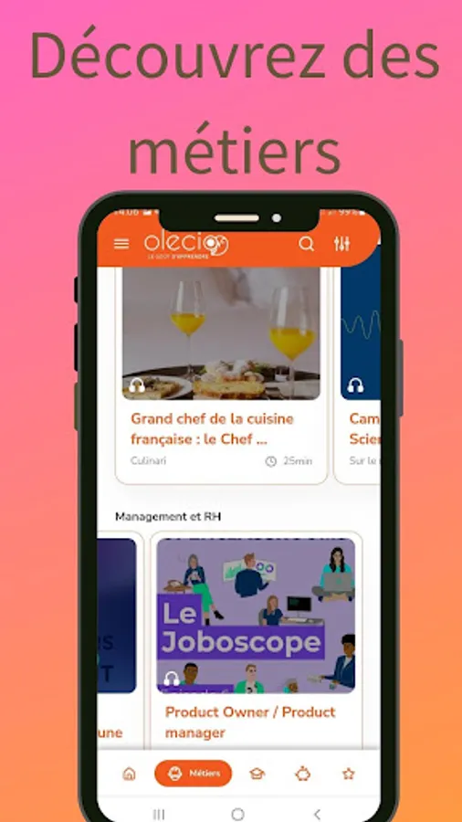 We select for you the best podcasts, videos, web games to help you discover new subjects, jobs and training around your areas of interest! And the application is 100% free to promote access to all.