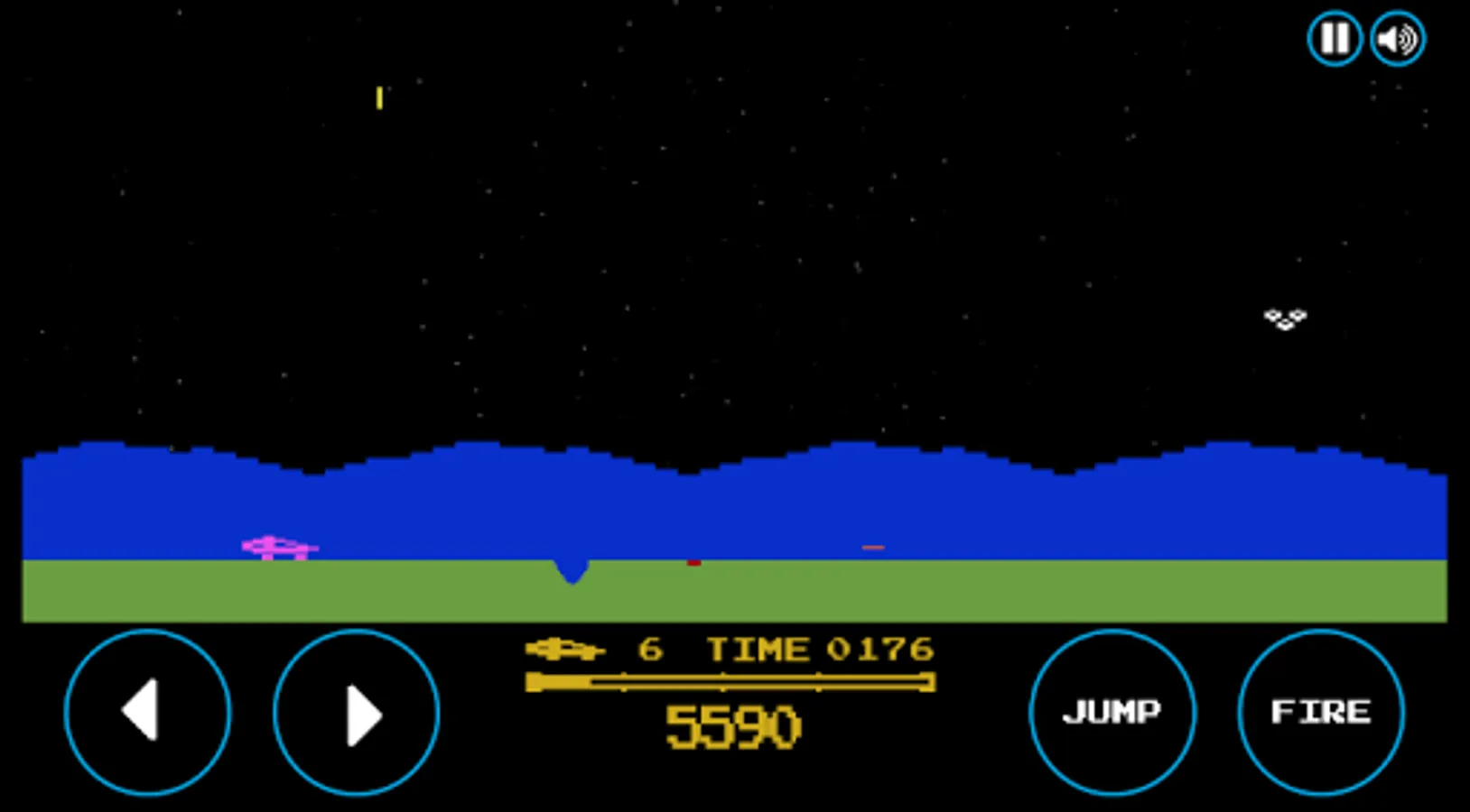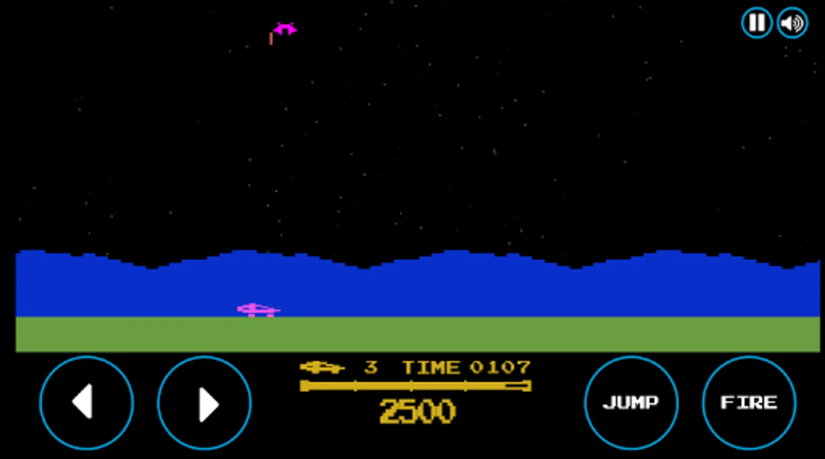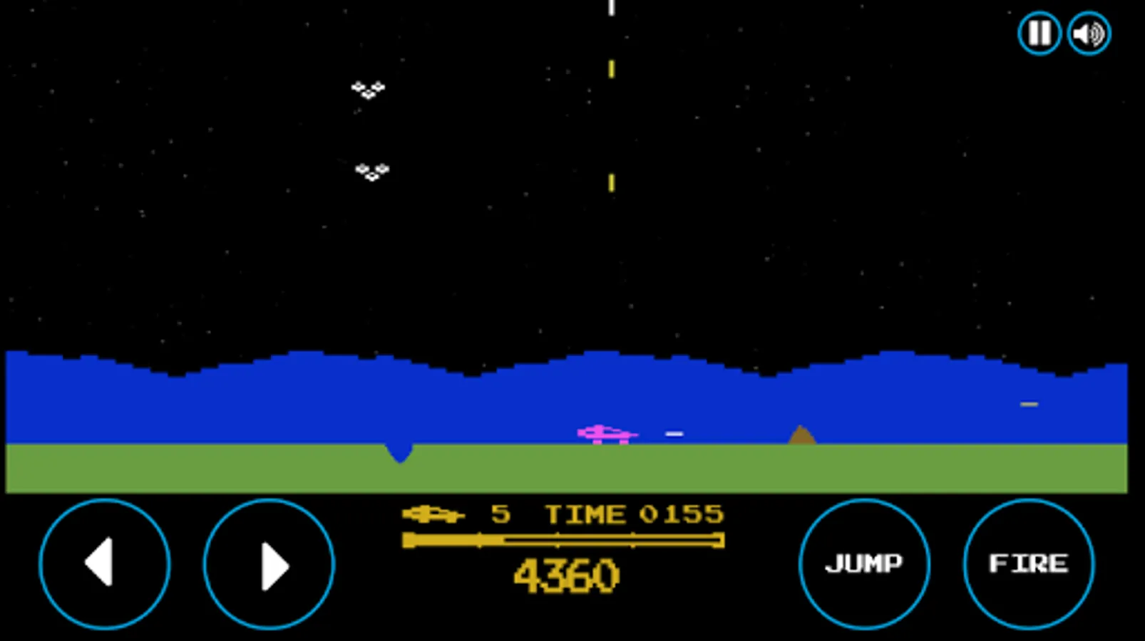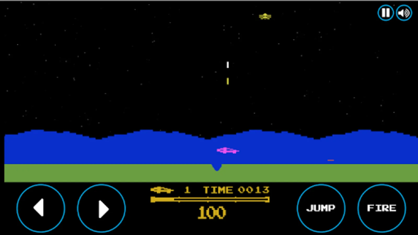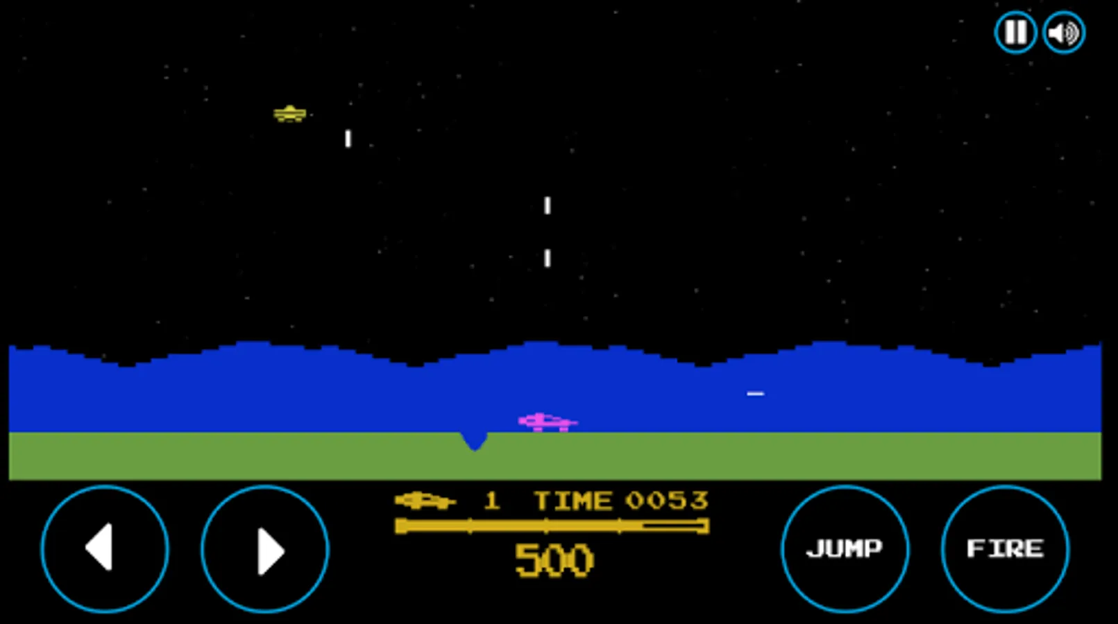 Embark aboard a vehicle and eliminate flying saucers, tanks, jump above craters, mines and bring down the blocks of rocks.