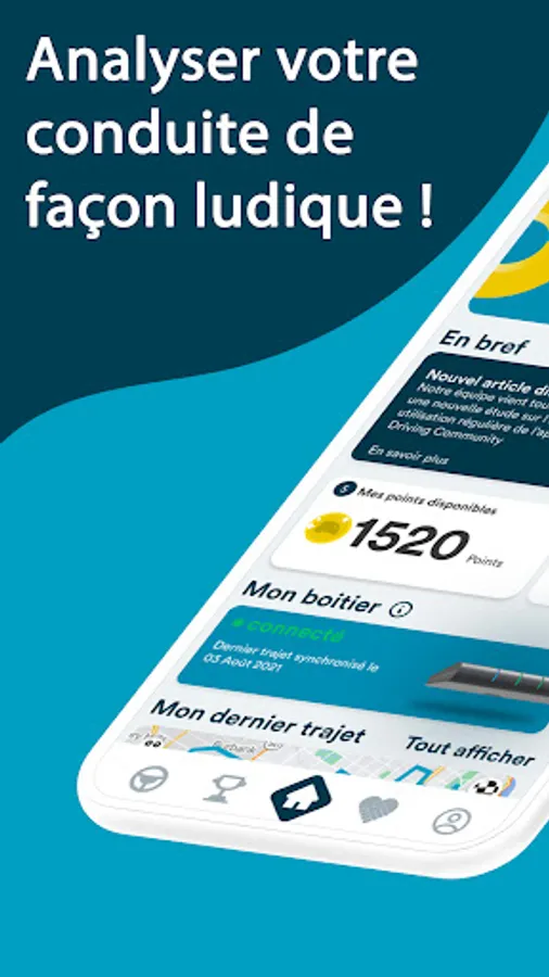 Connected to a box installed in your vehicle, we allow you to access the precise analysis of your driving through the mobile application: you benefit from scores characterizing your driving and personalized advice. You can thus understand your daily driving behavior, identify notable events on your journeys with our interactive map, and reduce risks by adopting safer driving over time.