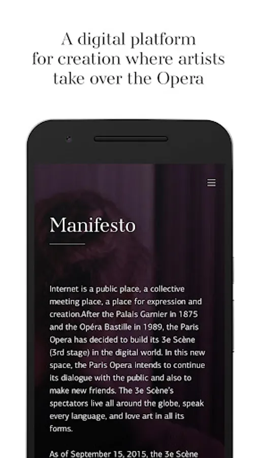 Launched in September 2015, the 3e Scene is a space dedicated to digital creation and artistic experimentation, alongside the Palais Garnier and the Opéra Bastille. A digital showcase to discover art in all its forms through original works with a bearing on opera, music, or dance.