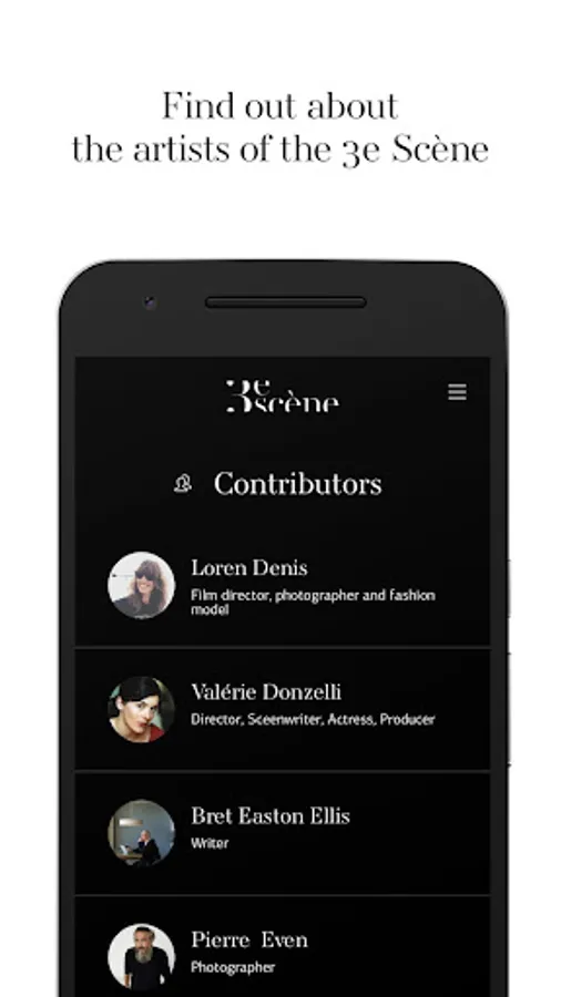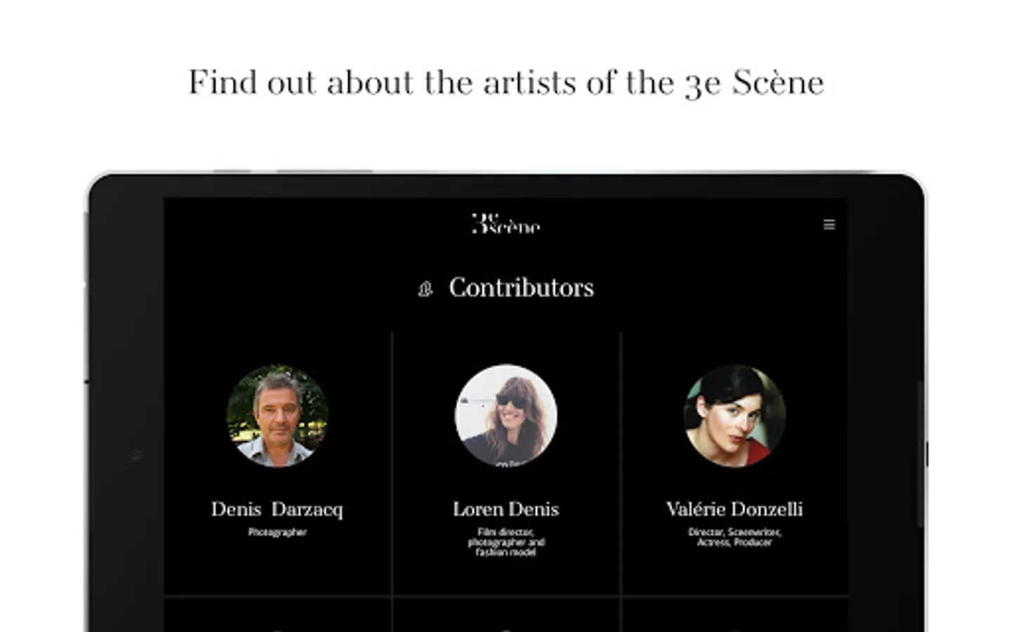 Since its creation, renowned artists have joined the 3eme Scene to offer original works accessible to all. Among them, Mathieu Amalric (director and actor), Xavier Veilhan (visual artist), Alex Prager (photographer and director), Eric Reinhardt (writer) Glen Keane (Disney's legendary animator) and Bret Easton Ellis (writer).