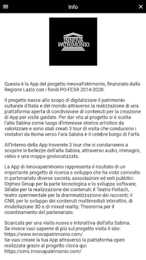 This is the App of the InnovaPatrimonio project, financed by the Lazio Region with the PO-FESR 2014-2020 funds.