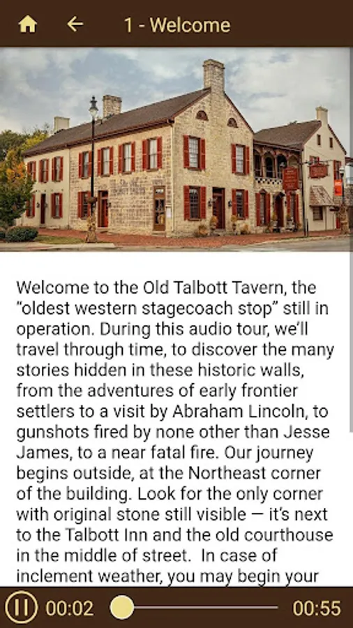 Welcome to the Old Talbott Tavern, the “oldest western stagecoach stop” still in operation. With this audio tour, we’ll travel together through time, to discover the many stories hidden in these historic walls, from the adventures of early frontier settlers to a visit by Abraham Lincoln, to gunshots fired by none other than Jesse James.