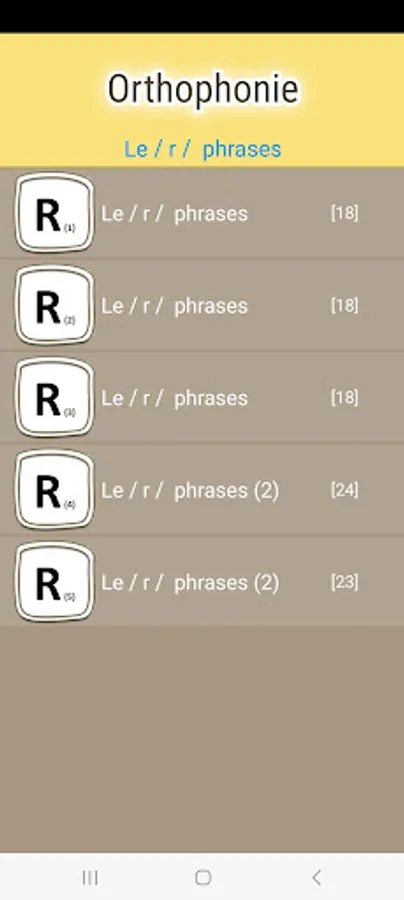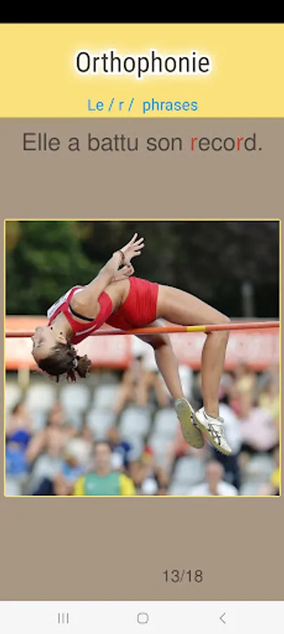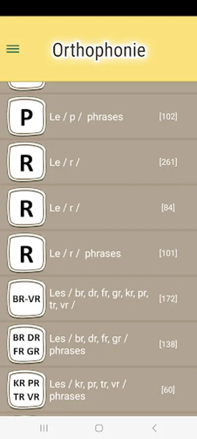 The exercises are progressive. Each sound is proposed in a list of words in initial, middle or final situation. Some particularly difficult sounds, such as R and L, can be worked on first in isolation and then in complex groups.
