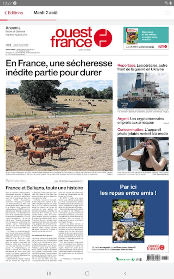 The digital newspaper Ouest-France is 40 editions available from 5 a.m., with the possibility for subscribers to download 2 per day in addition to the France edition. Every morning, consult your favorite edition and take stock of the news of the day, from the world to your municipality, with the analyzes and decryptions of our journalists.