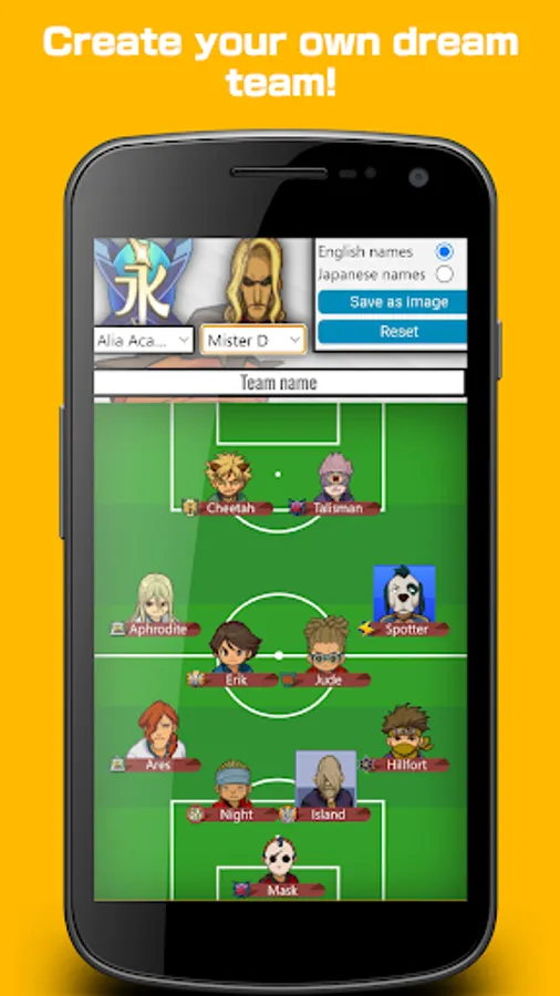Before adding team members, you can change the player names to English or Japanese names. You can also choose a formation, an emblem and a coach.