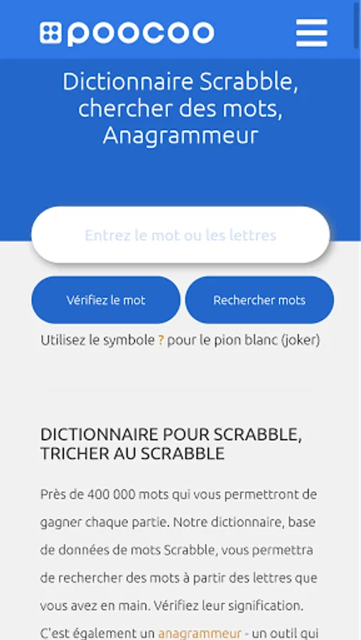 Almost 400,000 words that will allow you to win each game. Our dictionary, a database of Scrabble words, will allow you to search for words based on the letters you have on hand. Check their meaning. It is also an anagrammer - a tool that allows you to create anagrams. Scrabble online. Cheat scrabble.