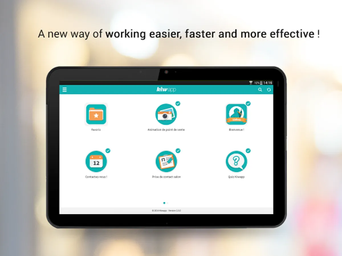 Install Kiwapp Team on your sales forces’ tablets and smartphones and provide all your sales tools in a single application. CRM, product catalogue, customer information, sales pitch, data collection form, quiz: no matter the task, Kiwapp Team will improve your sales department productivity!