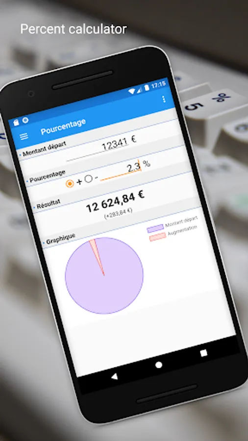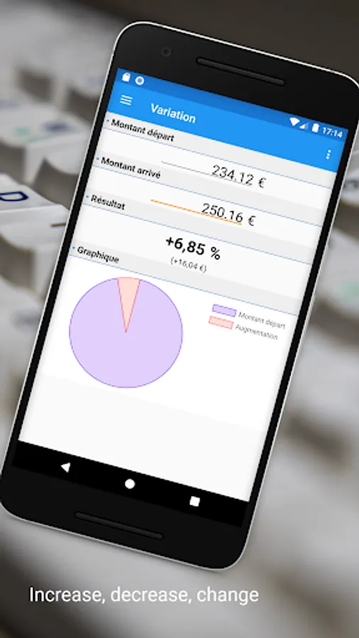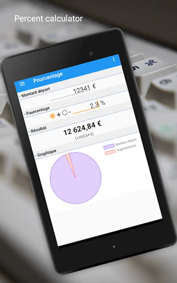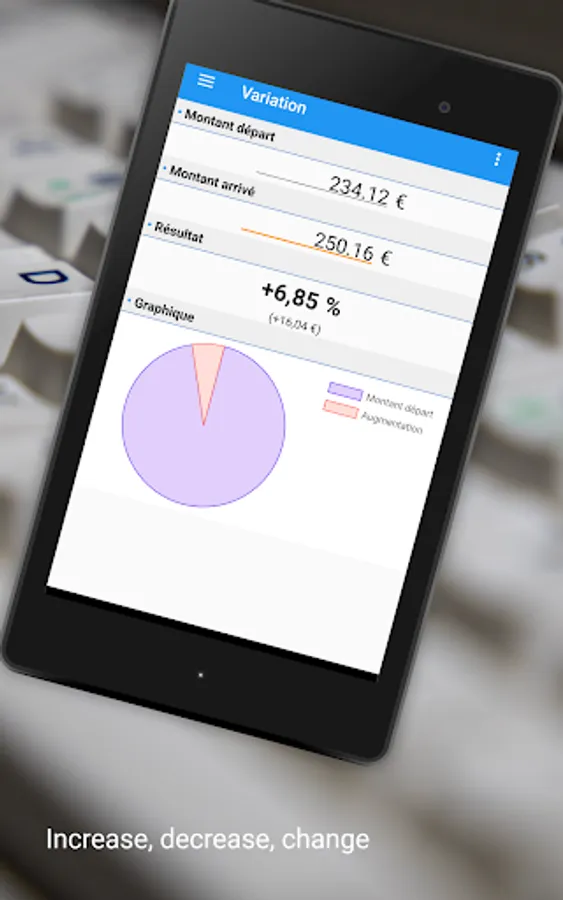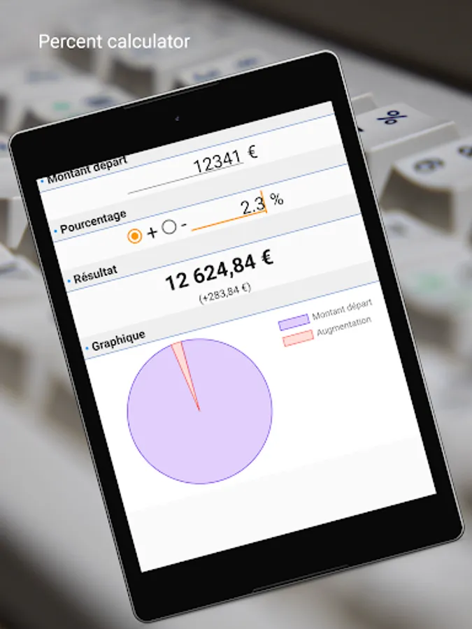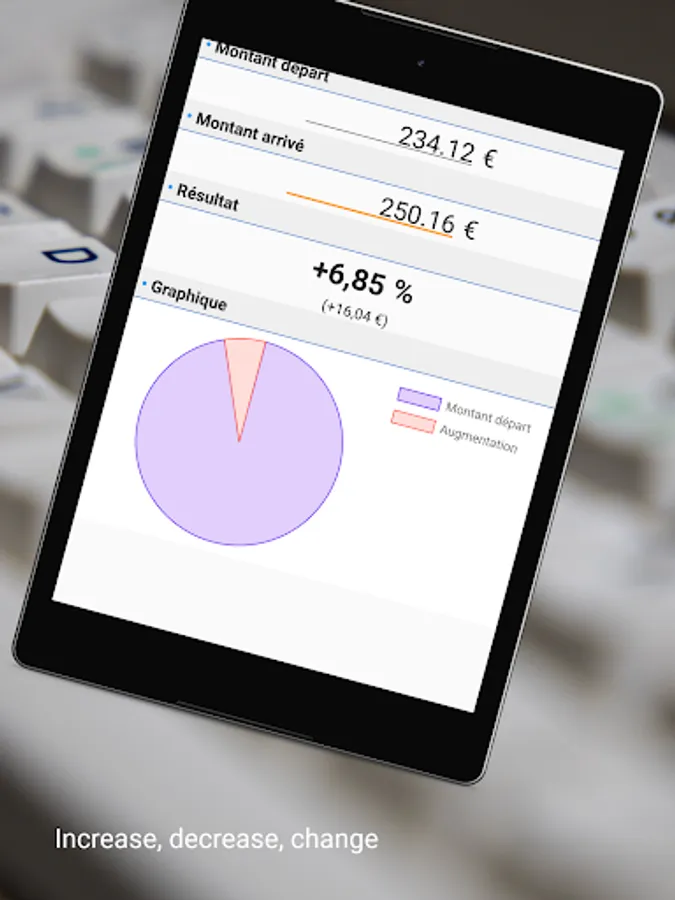 This application allows you to easily calculate a percentage increase or decrease. (salary, finance, prices, vat, etc...)