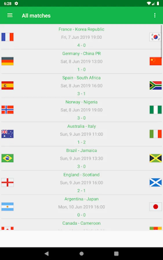 - Calendar of all matches (group, knockout round, quarterfinals, semifinals and final)