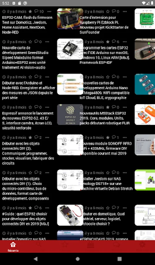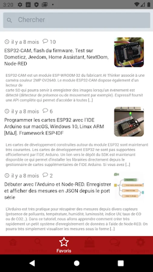 More than 60 categories of articles are available to easily search for a tutorial, a test or a project. News of mini PCs (Raspberry Pi, Orange Pi), micro-controllers and development boards based on ATmega (Arduino), ESP32, ESP8266, framework for the development of DIY connected objects (Blynk, Cayenne, MySensors, ESP Easy , Johny-five), Arduino / ESP32 and ESP8266 microcontrollers programming (client / server programming, NTP time server, SPIFFS memory, HTML / CSS Web interfaces with Bootstrap ...), home automation equipment (Xiaomi Aqara and Mijia, Sonoff), installation and configuration of a DIY home automation box (Node-RED, Domotic, Jeedom, Home Assistant, Homebridge ...), dashboard and data storage (influxDB, MongoDB), home automation protocols (MQTT, HTTP, Websocket ...), development environment for IOT projects (NodeJS, MicroPython Arduino IDE, PlatformIO), retro gaming, linux and Raspbian tutorials