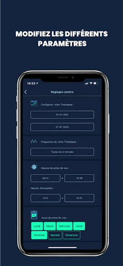 To capture the best moments of your project and to ensure better battery performance, set the days, times, and the start and end date for taking a photo. Set the frequency of your timelapse according to your project (choice of frequency: one photo every minute, up to every 24 hours).