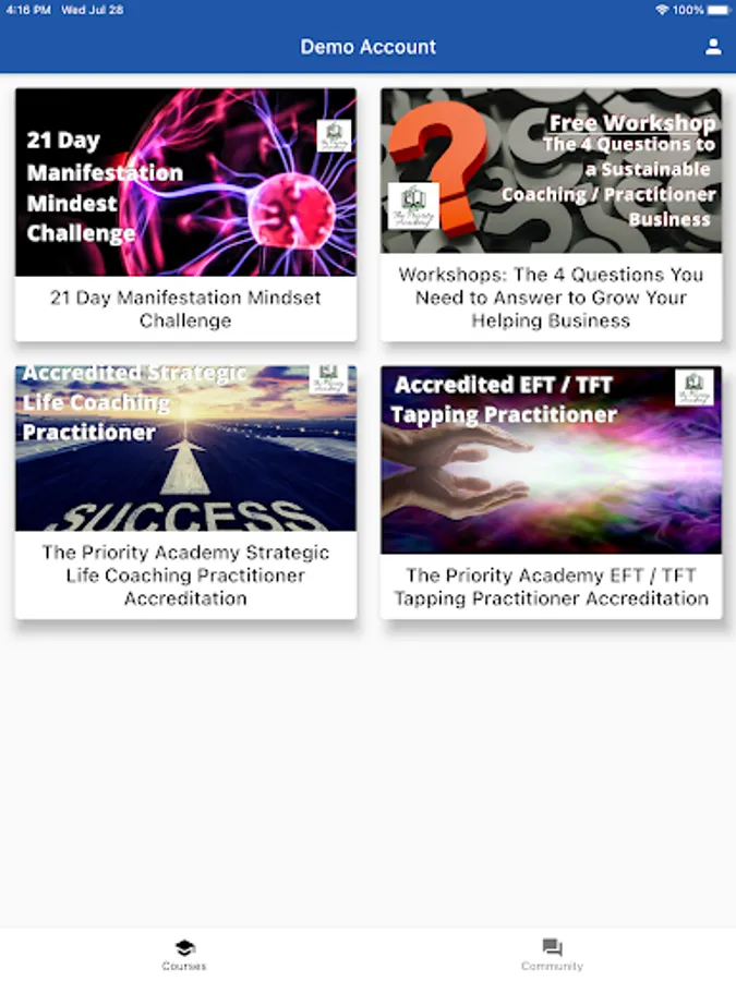 The Priority Academy provides the high quality, cost effective and supported training that you need to create a sustainable practice in the helping industry. Whether you are, or want to be, a Life Coach, Practitioner, Complementary Therapist, or in any other area of the Helping Industry, The Priority Academy has a full suite of courses to help you do just that. Whether you want to learn NLP, Strategic Life Coaching, Meditation, Mindfulness, EFT Tapping, CBT. Group Coaching, Hypnotherapy or Law of Attraction Coaching, The Priority Academy has the course for you. At The Priority Academy we are not only a mission to provide high quality training courses, we are also on a mission to break down the barriers to the Helping Industry. All of our courses are cost effective so as to remove price as a barrier, plus we also offer courses in how to start and grow your business. If you are looking for an all-in-one package to help you get trained, start and grow your practice into a sustainable business, we are here to help you. PLUS there is a community filled with like minded individuals who will help you along your journey! Download the App now and let's get started! Courses include: NLP (Neuro Linguistic Programming) Practitioner & Master Practitioner, Strategic Life Coaching, Meditation Teacher / Practitioner, Mindfulness Based Cognitive Therapy (MBCT), EFT (Emotional Freedom Technique) Practitioner & Master Practitioner, CBT (Cognitive Behavioural Therapy) Coach, Life Purpose Coach, Solution Based Hypnotherapy Practitioner, Self Hypnosis Practitioner, Emotional Intelligence Practitioner and many more. Download the App for free today and let's get started! PLUS => Get a Free 4 Part Workshop when you Sign-Up Now!