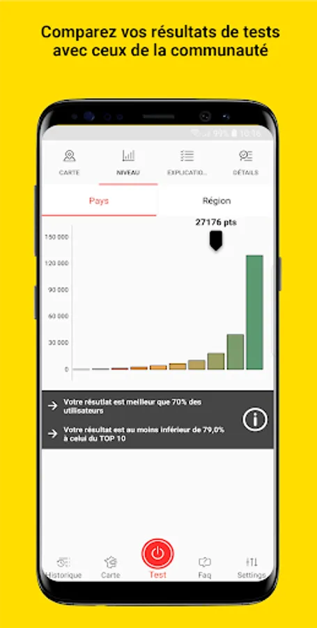 DébiTest 60 is used in visitor or connected mode and allows a complete test whose results are memorized so that you can consult them as you wish and analyze them. DébiTest 60 gives you the performance of your connection as well as those obtained by the members of our community of users. You can compare your performance to that of other users of the main national operators (in visitor mode you are limited to the results of your operator only).