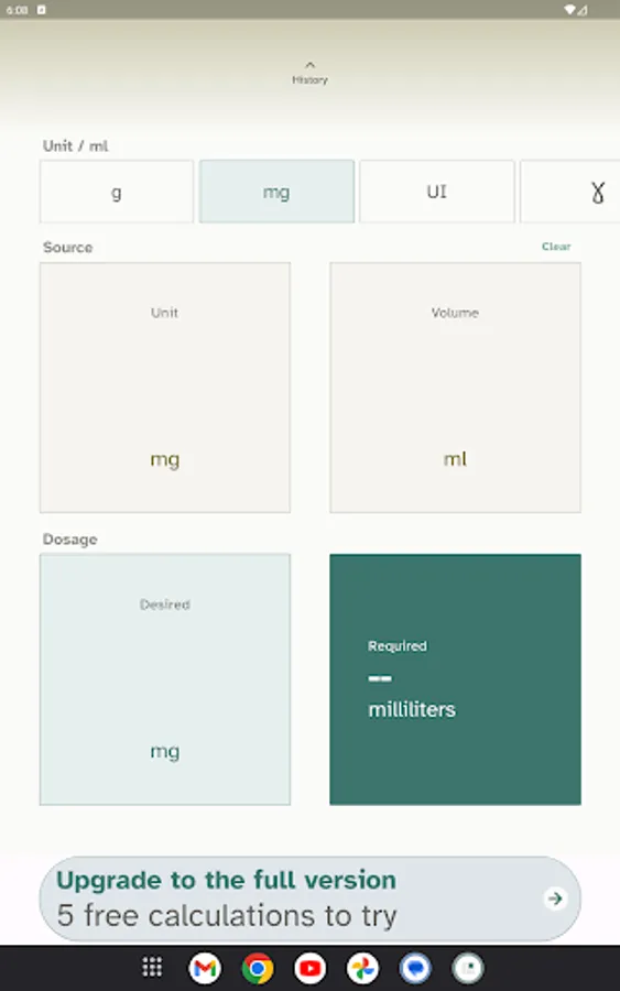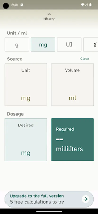 1. Select the basic unit of the concentration of your solution from those proposed (g, mg, µg or IU)