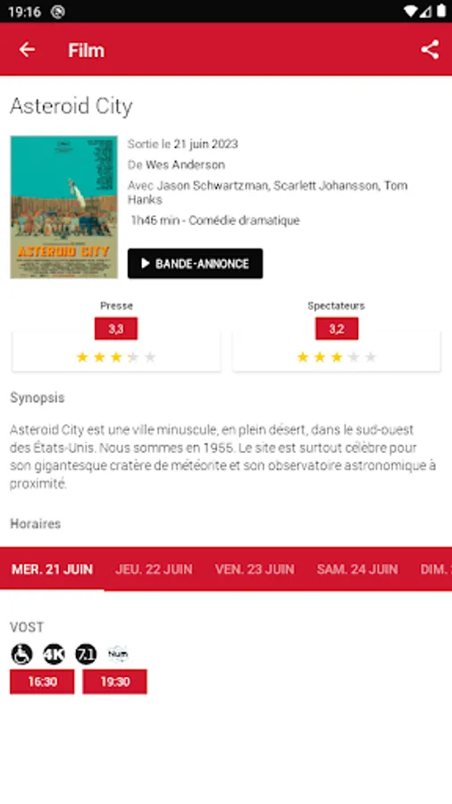 VERY COMPLETE FILM SHEETS- High quality posters, photos and trailers- Genre, duration, casting and release date- Synopsis- Possibility of sharing your desire to go to the cinema with these contacts