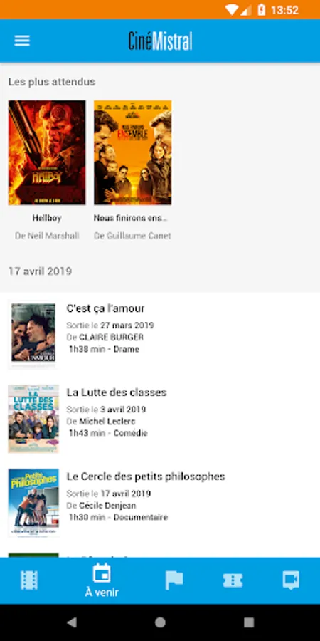Find at any moment all the information of your CineMistral Cinema Frontignan on your Smartphone! The films on the bill, the hours of the sessions, the movie cards and the events and practical information of your cinema!