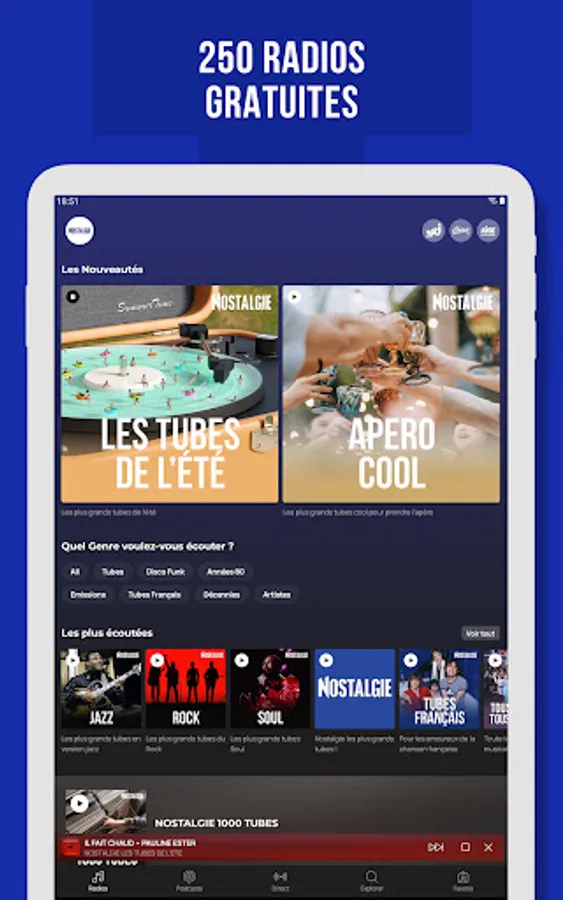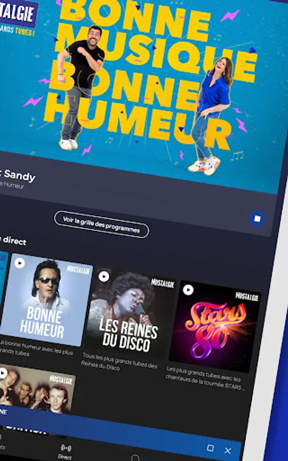 • With Nostalgie, the No. 1 musical radio station, listen to all the greatest hits of French chanson, and all the greatest pop-rock, folk, soul and disco artists in digital HD 576 kbps quality.