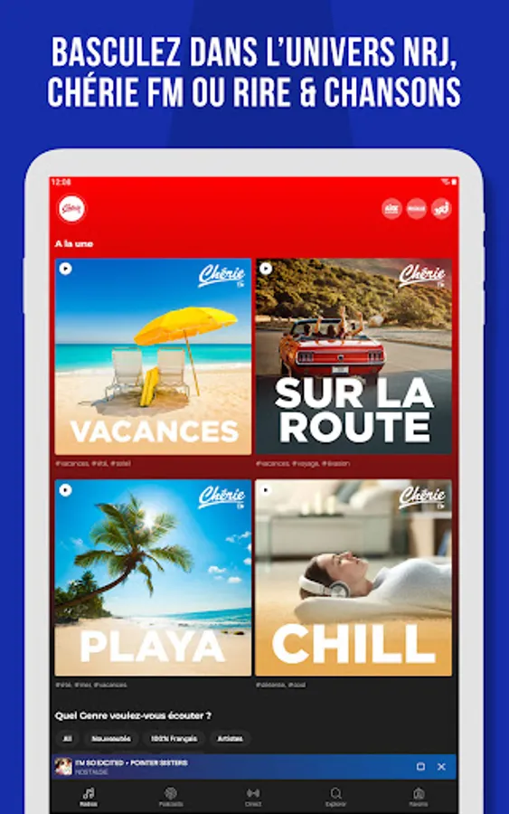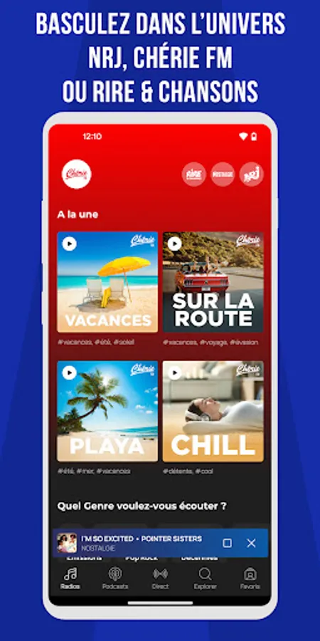 Press the NRJ, Chérie FM or Rire & Chansons logo to switch automatically to the world of this radio station, while retaining access to the entire NRJ Group radio and podcast catalog.