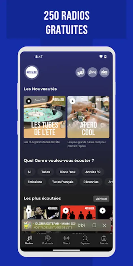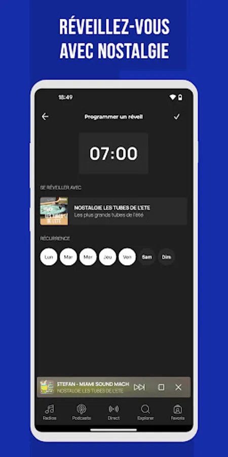 • Wake up with Nostalgie or one of the 250 radios of your choice with the "Alarm clock" function. (New in this version)