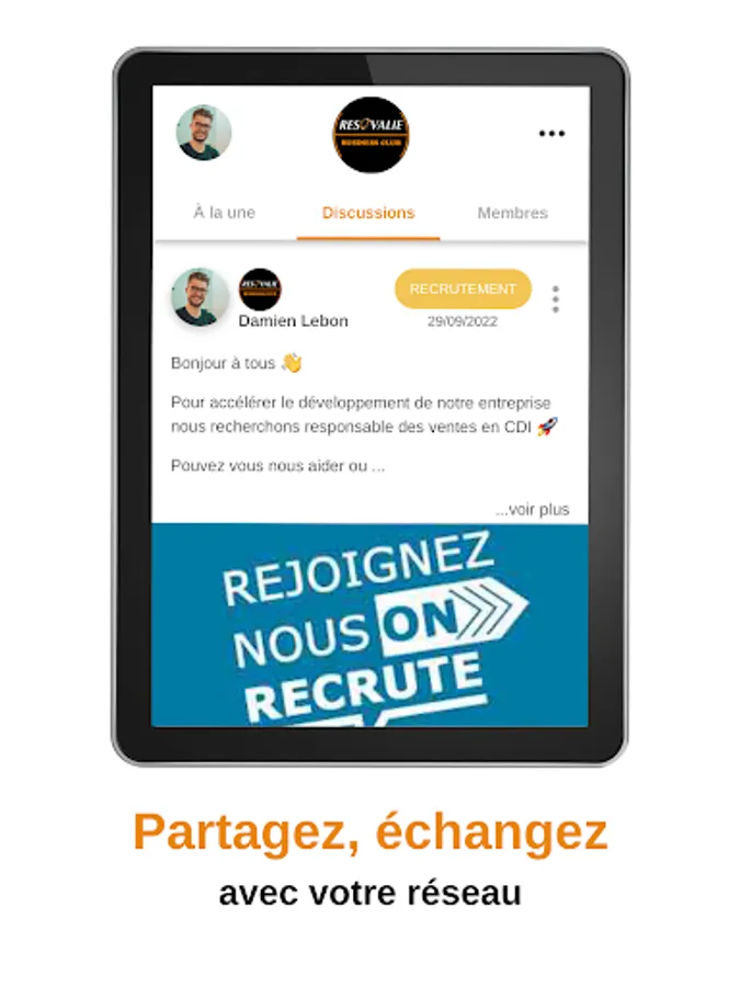 Discuss, connect and follow the news of RESOVALIE BUSINESS CLUB. Find members of different clubs and develop your network in your new application!