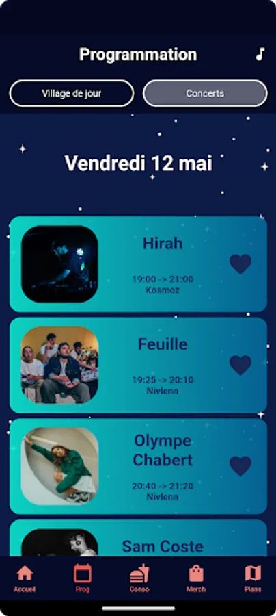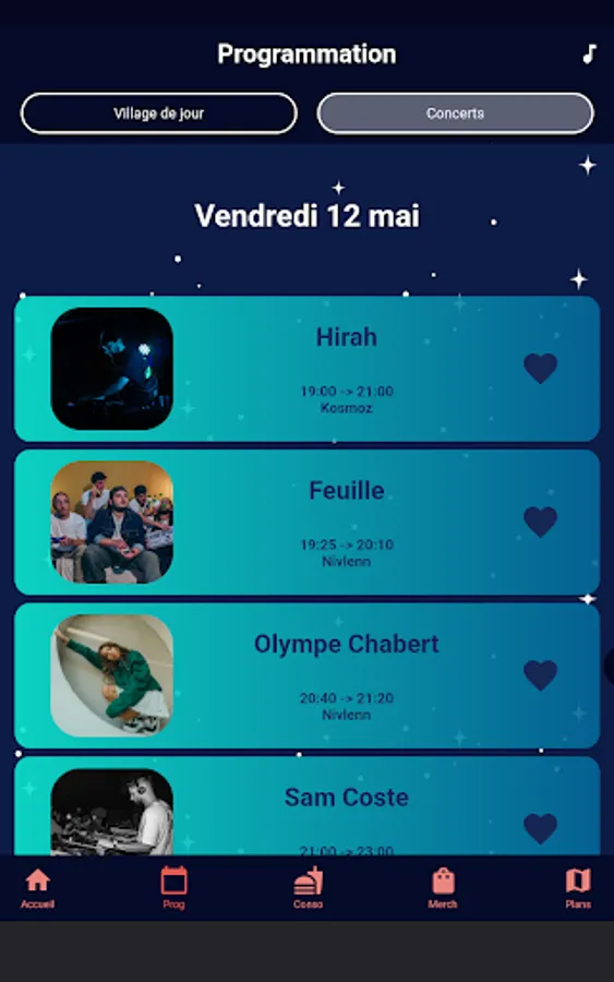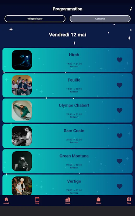 Like artists in the event list to receive a notification 15 minutes before they go on stage.