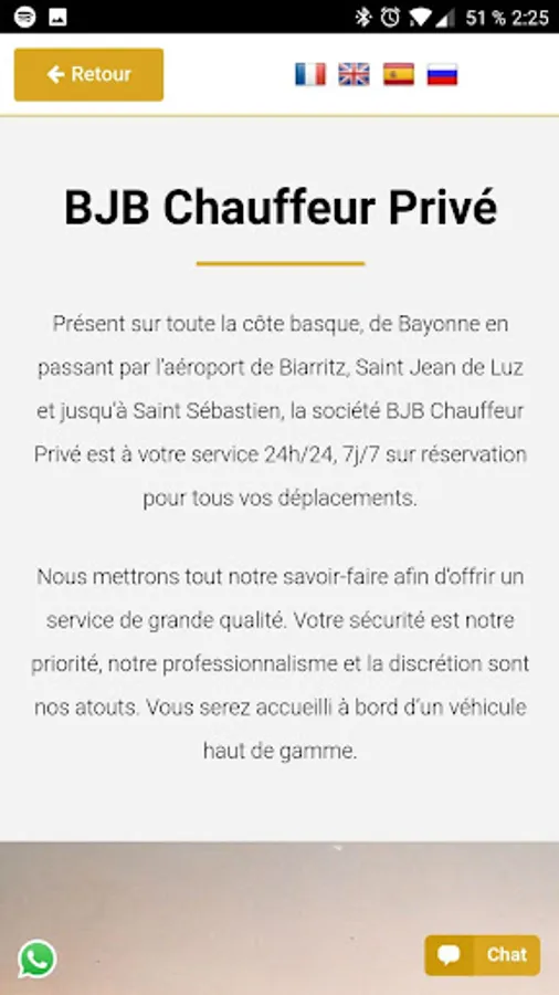 Book your VTC driver, plan your sightseeing tours, or discover our services, the application BJB Chauffeur Privé will be very useful during your stay in the Basque Country. Arrived at the airport of Biarritz Basque Country or any other airport and station of the area, your driver will wait for you directly at the arrivals and you will let you drive to your hotel or your apartments. Book and pay securely directly on the app. For the tourist circuits and other services, we propose you a list which of course is flexible according to your desires, do not hesitate to contact us for more information.