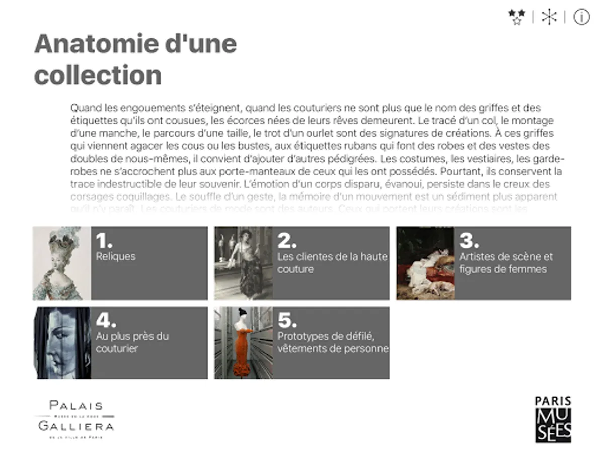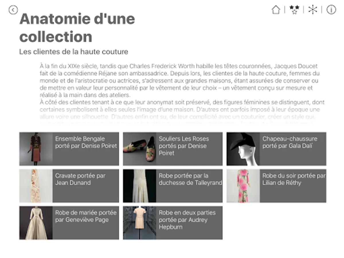 As part of the exhibition Anatomy of a collection presented at the Palais Galliera of 14 May to 23 October 2016, Paris Museum and the Musée Galliera offer enriched small newspaper, downloadable tablet. From fifteen flagship works of the exhibition, this application allows to discover the themes developed with numerous illustrations and archival materials to explore the collections of the Musée Galliera and deepen the visit of the exhibition.