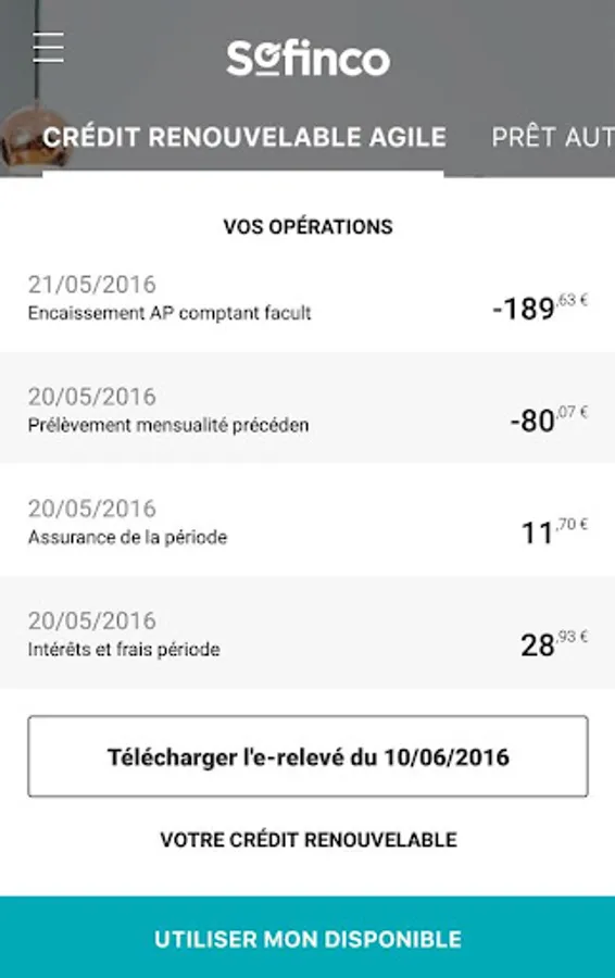 Consult your latest transactions, download your latest e-statement, using some or all of your available by requesting a transfer, divide your spending cash / credit, modify personal information, subscribe to e-statement ... The first implementation Sofinco which gathers all your Sofinco and partner products!