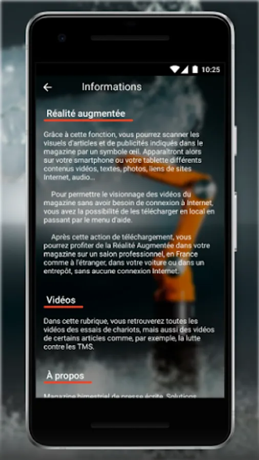 Handling Solutions is the bimonthly magazine for the written press of warehouse equipment and solutions. The application allows you to enter immediate immersion in some of the editorial and advertising content indicated in the magazine by an "eye" symbol. These interactive visuals are associated with videos, new photos, audio content or links to web pages.