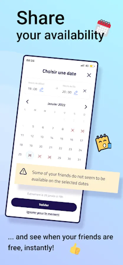 Get more positive answers! Before sending an invitation, Sparqle checks your friends' availability to suggest dates that are most likely to suit everyone.
