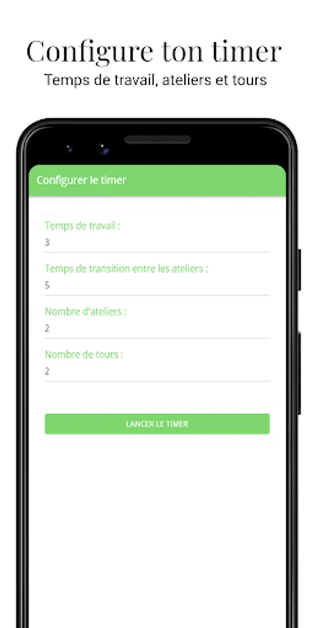 Configure your workshops add transition time between workshops, indicate the number of workshops you plan to do, set the number of laps, configure transition time between round and go!